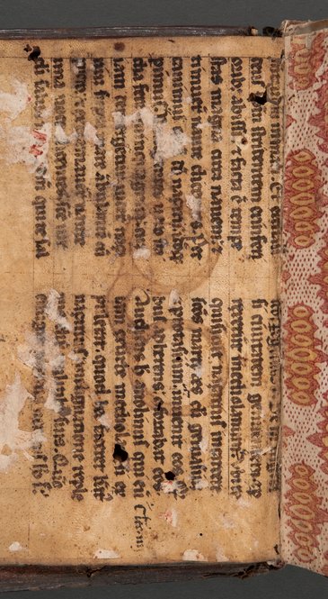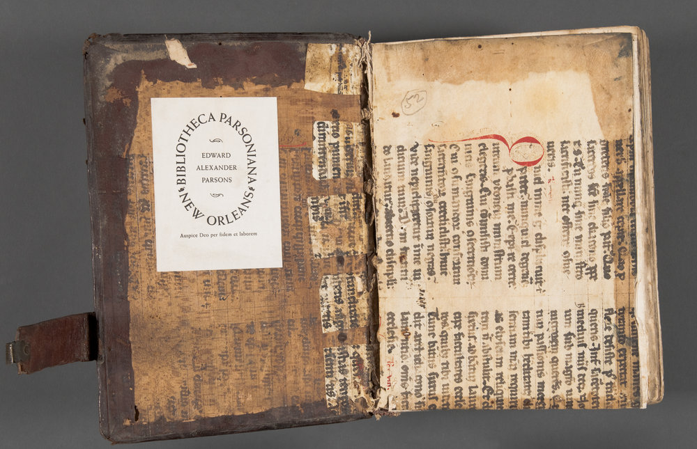 April 17, 2012, Filed Under: Books + ManuscriptsEarly printed book contains rare evidence of medieval spectacles Many scholars rank the invention of eyeglasses among the most important contributions to humankind in the last 2,000 years. Yet, the inventor of this now thoroughly quotidian piece of technology remains anonymous. Indeed the inventor (or inventors) will almost certainly never be known, given the numerous conflicting claims, lack of specificity, and scarcity of surviving documentation. What scholars do know about the history of eyeglasses is that they were probably invented at the end of the thirteenth century by a craftsman living near Pisa. The evidence originates from a passage by Friar Giordano da Pisa who recounts having met the anonymous craftsman in 1286. A friend of Giordano named Friar Allesandro della Spina learned how to make them shortly thereafter and shared the secret with the public. A number of other possible inventors of eyeglasses have been posited over the centuries, all of which have finally been proven spurious in recent scholarship.1 During the early period of the production of eyeglasses, they were referred to as vitreos ab oculis ad legendum (eyeglasses for eyes for reading) and oglarios de vitro (spectacles with glass lenses). Eventually these rather clunky terms were shortened to occhiali and ocularia. Either way, the evidence indicates that spectacles were probably invented in Italy at the end of the thirteenth century, and by the early fourteenth century, they were being produced and sold in Venice. Scholars believe that by the end of the fifteenth century, spectacles were probably being sold and produced throughout most of Europe, with countries like England importing them by the thousands. Florence led the way in manufacturing and apparently produced some of the highest quality spectacles. Despite this widespread production, there are relatively few surviving specimens. Indeed, although Florence was known to be a major producer, archeologists have found only one pair of rivet spectacles in that city. It is with this in mind that it becomes all the more significant to find evidence of a pair of medieval spectacles anywhere at all. One can imagine why the recent discovery of what appears to be an impression of a pair of medieval rivet spectacles in one of the Ransom Center’s early printed books was cause for excitement. While conducting a survey of manuscript waste found in early printed books I noticed a faint reddish-brown impression of a pair of spectacles on the rear parchment endpapers of a copy of the Opera of Fr. Luigi di Granata. The endpapers in this book comprise a piece of parchment taken from a page in a medieval manuscript (it was a common practice in the hand-press period to reuse old disbound parchment manuscripts for endpapers, pastedowns, stubbs, or spine linings). A discovery like this is fairly uncommon. Among the many thousands of medieval manuscripts and early printed books in U.S. libraries, only a handful of similar discoveries have been made: a pair of spectacles found in the Folger copy 46 of the First Folio at the Folger Shakespeare Library; the outline of a pair spectacles carved into the wooden boards of a sixteenth-century volume in the rare books department at Catholic University of America and in a fifthteenth-century Breviary at the Fribourg, Bibliothèque Cantonale et Universitaire (seen in Christopher De Hamel’s History of Illuminated Manuscripts, fig. 193); and an impression in a manuscript at the Walters Art Museum. One medieval scholar who has conducted a survey of more than 3,000 manuscripts in the United States informed me that he had encountered only one such example. The earliest spectacles comprised two convex glass disks enclosed in metal or bone rims with handles centrally connected by a rivet and could either clamp onto the nostrils or be held before the eyes. Later specimens had wire and even leather rims. We know this not only from surviving examples but also from artistic depictions. A painter from northern Italy working in 1352 provides us with the first depiction of spectacles. It appears in a fresco that adorns the Chapter House of a Dominican monastery in Treviso, Italy. The Cardinal Hugh of St. Cher can be seen hard at work in his study with quill, parchment, and a pair of early spectacles on his nose. St. Jerome, the famous scholar-saint and translator of the Latin Bible, also was frequently depicted wearing spectacles in his study. Advanced scientific methods for dating aside, we can get a good estimate of the age of the eyeglasses that left the impression on the parchment by first examining the script on the parchment (to establish the earliest possible date) and then by looking at the shape of the impression itself. The text is what is known as Southern Textualis or Rotunda. Southern Textualis was popular in Italy and Southern Europe between the late 1200s and the late 1400s. Alternately, the 1568 publication of the printed text provides us with a possible later date. Regardless, the spectacles conform to the physical features and rough time period for early medieval leather-framed spectacles.* But dare we hope for more? Because the book was printed in Venice, Italy, the tantalizing possibility exists that the wearer who deposited his spectacles in between the parchment leaves may have been using a pair of the earliest eyeglasses ever made, because Florence, where eyeglasses were invented, is less than 165 miles from Venice. Although we may never know exactly how (or when) these spectacles left their mark on the parchment, their faint impressions nevertheless offer an intriguing glimpse into the early history this important invention. 1This topic, and the history of spectacles in general, is thoroughly summarized in Vincent Ilardi’s Renaissance Vision from Spectacles to Telescopes (Philadelphia, PA: American Philosophical Society, 2007). *The author now concludes that the shape of the spe