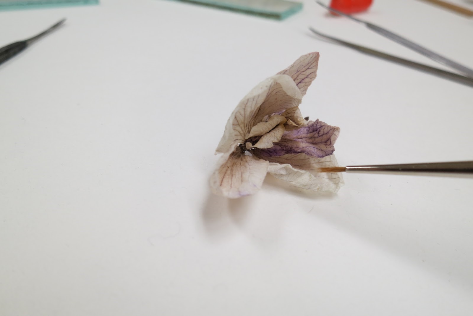April 21, 2016, Filed Under: ConservationSay it with flowers Princess Marthe Bibesco was the quintessential Napoleonic cosmopolite—worldly, literary, political, and modern Prince and Princess Bibesco wedding, 1919. Image taken from “An Autobiography” by Margot Asquit published by Doran, New York in 1922 A noble birth Born into Romanian nobility in 1886, Marthe Lahovary came of age in the grand tradition of true European monarchy. She was surrounded by the haut monde of her time—palaces, kings and queens, and complex social hierarchies that were of utmost importance in her world. While the people of Romania still lived the pastoral existences of a fading era, Princess Bibesco flew with her pilot husband on exotic expeditions, nursed wounded soldiers in the Balkan wars, and maintained alliances in every major European city. Bibesco also defied expectations and became a very popular author in her day. She wrote historical fiction centered on the social machinations of European noblesse, and travelogs based on her excursions to the Middle East and Africa. A persistent paramour Some of the more enchanting pieces in her Princess Bibesco’s papers at the Harry Ransom Center are love letters written from one of her famous paramours—France’s Prince Charles Louis de Beauvau-Craon, who adored Bibesco despite her obvious inaccessibility. Photo of the pressed flower and obscured text before humidification. Photo by Genevieve Pierce Kyle Along with his letters, de Beauvau-Craon wrote notes on flower petals and sent them as little gifts for his beloved. Alongside manuscript letters from 1911, the Bibesco archive contains these flower petals, which were inscribed in ink by de Beauvau-Craon and then pressed and sent with his letters to the Princess. A 104-year-old pressed flower can barely be handled safely, much less opened, and the inscription was assumed to be lost. Invisible ink My goal was to uncover the concealed ink on these pressed flowers so that the lost inscriptions would be available to researchers and patrons of the Ransom Center. Paper conservator Jane Boyd and I determined that humidification provided the best approach to open the pressed flowers. Usually, humidification is used in paper conservation to remove creases or open folds, and to make paper revert to its original, flat state. Our goal here was to take the botanical specimens and humidify them in order to revert them to their original three-dimensional state. Test run on a non-archival pressed flower. Photo by Genevieve Pierce Kyle Instead of testing this risky treatment on the original artifacts from the Bibesco archive, I tested other pressed botanical specimens and found that after humidification they would revert back somewhat to their original shape, and at the least could be opened from a flattened state. The pressed flowers became pliant and soft when humidified, and I was able to gently coax them open using a slightly damp brush. Pressed flowers in the humidification chamber. Photo by Genevieve Pierce Kyle After testing pressed flowers that we inscribed with a variety of inks, I was certain that humidifying the archival objects would be successful. After a few minutes in a humidification chamber, the folds of the pressed flower became pliable. I then exposed the creases of the petal to minimal local humidification using a brush, and gently encouraged the flower to open. Upon opening the flower, the inscription revealed the princess’s name, along with the name of her well-known paramour Charles Louis, and the year 1911. Flower petal restored to its open shape and inscription revealed. Photo by Genevieve Pierce Kyle The inscription that was revealed in its entirety reads: Marthe Charles Louis Beauvau Craon 1911 A love unfurls We thought there was probably no inscription on this flower. Photo by Genevieve Pierce Kyle After this first success, we decided to open the second, larger flower, inside which was an even more obscured inscription. In fact, in preparation for this treatment we tried to discern if there was actually an inscription at all, as the flower was pressed completely closed and seemed brittle and unable to open. We looked at it on a light table and could see absolutely nothing that looked like writing or ink. But once opened, the inscription was revealed. Photo by Jane Boyd We decided to start with a minor humidification, to open the flower slightly and see if any inscription could be found. As it began to humidify and open on its own, I was able to gently open the crease and saw that there was indeed writing on the interior. We continued humidification, carefully turning the object over consistently so that it could receive an equal amount of moisture throughout the creases. I was then able to work out the remaining folds using a slightly damp brush, and coax the flower open to a degree that the inscription could be easily read and photographed. Inscription revealed! Photo by Jane Boyd It appears that the inscription reads: Lyoss Charles Louis Marthe j hov. How to store? Now that it’s had its treatment, the flower has been opened and is no longer a flat, pressed botanical specimen, but a larger object. Hence the final aspect of this treatment entailed consulting with colleagues about the design and creation of an appropriate housing and storage space. A newly constructed housing is better suited to the larger flower now that it is no longer pressed and flattened. Photo by Genevieve Pierce Kyle I hope the treatment of these flowers has added an exciting new dimension to an already rich collection, and that researchers of Princess Marthe Bibesco will have a new facet to study. Genevieve Pierce Kyle is a digital archivist at the Briscoe Center for American History at The University of Texas at Austin and a paper conservator in private practice at The Microspatula. She volunteers with the Harry Ransom Center’s preservation and conservation division. Related content Q&A: Meet Ellen Cunningham-Krup