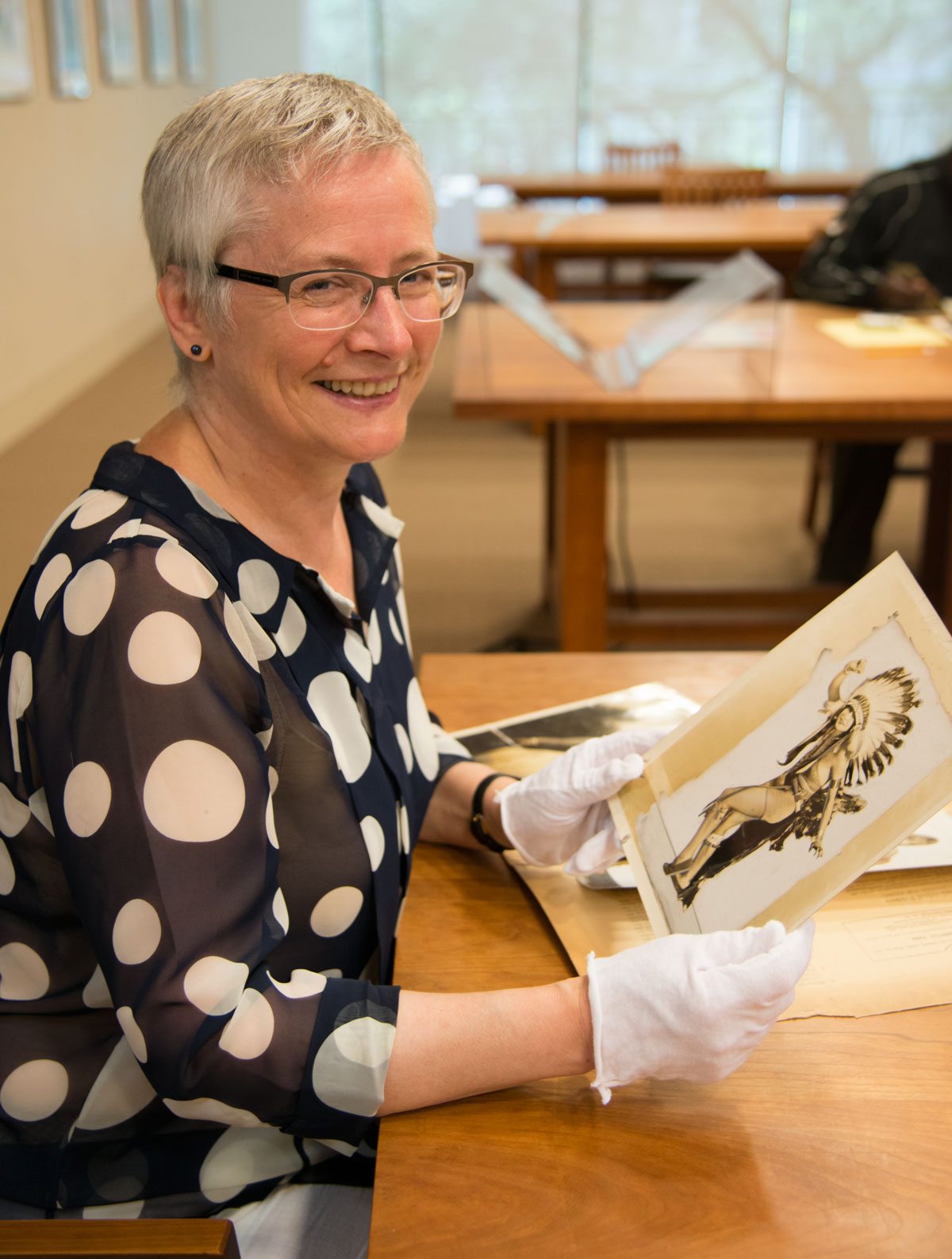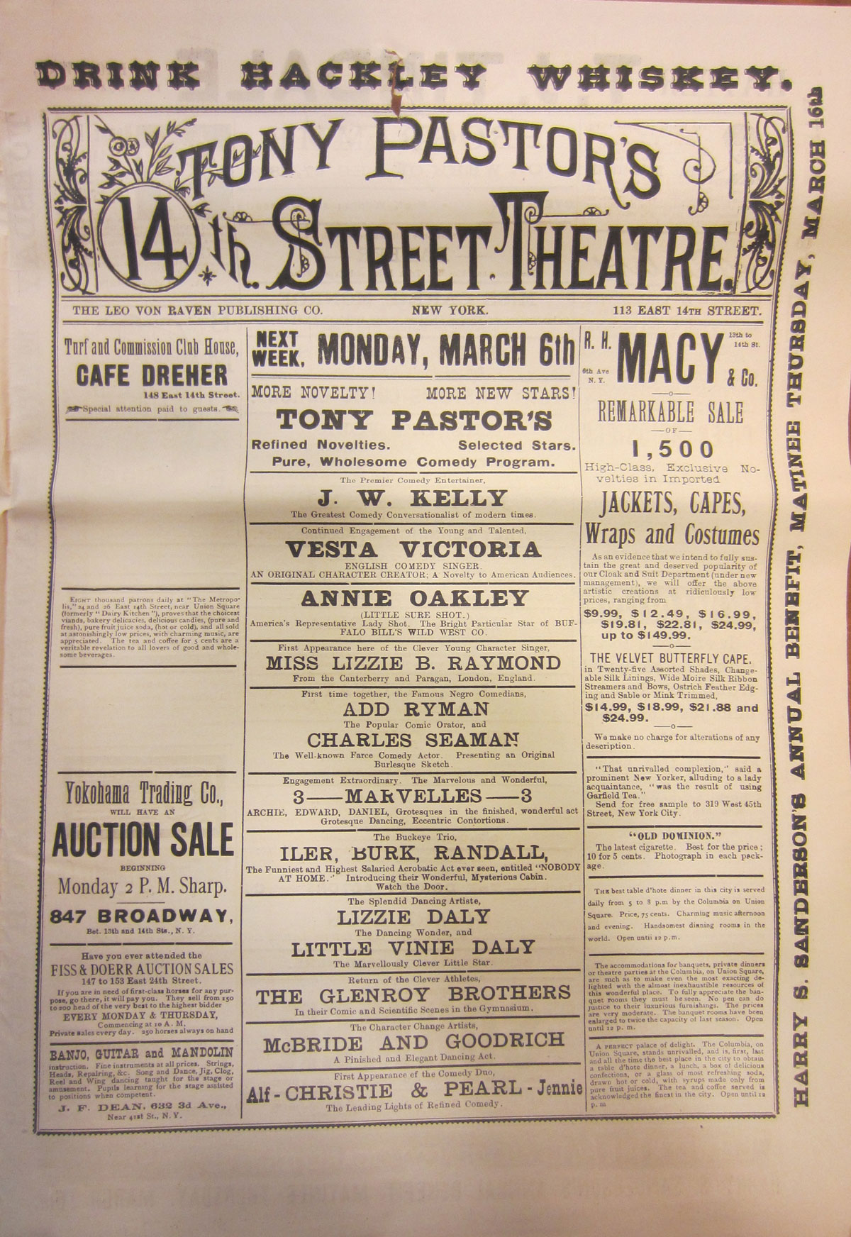 November 3, 2016, Filed Under: Research + Teaching, Theatre + Performing ArtsFellows Find: Seeing “the Indian” in vaudeville The bottom half of this postcard—one of many images in the Harry Ransom Center’s Tony Pastor collection—reveals a lot about the early days of vaudeville. Postcard showing Tony Pastor’s 14th Street Theatre. Theater Biography Collection, Harry Ransom Center It shows Pastor’s New Fourteenth Street Theatre in New York City, where he moved uptown in 1881 to initiate what was called “polite vaudeville.” It shows the price of seats (20 cents and 30 cents); the promotion of a “continuous show” (which allowed women to use vaudeville as a break between shopping expeditions or even as a kind of drop-in child care); and the giant playbills posted on the street front (promoting Irish skits, dialect comedians, singers and dancers of many nations, blackface duos, and Tony Pastor’s name looming largest of all). After two months in the archive, however, my eyes are insistently drawn way up, above the building’s cornice, to a detail less often noticed in this context: an Indian. This is the seventeenth-century Delaware leader Tamenend, made over as patron saint of the Tammany organization, in whose building Pastor’s theater was lodged. The statue tells us that vaudeville was literally invented under the sign of the Indian. That is not the usual depiction of vaudeville. Indeed, vaudeville is hardly ever discussed as a venue for Native performers of the late nineteenth and early twentieth centuries, who are almost automatically associated with Wild West shows. The image of howling warriors on horseback does not fit the snappy, modern novelty, the virtuosity and variety of vaudeville: unruly women singers, African American tap-dancers, Jewish comedians, Arabian fire eaters, Irish parlor tenors, Japanese tumblers, dog and monkey acts. The large collection of Tony Pastor materials shows that Indians were hard to find on his stages. Unidentified photographer, [Dorothy Deer Horn in “Thais”], 1931. Gelatin silver print, 10 x 8 inches, recto. New York Journal-American Photographic Morgue, Harry Ransom Center “Indian” acts and Indian performers But there were both “Indian” acts and Indigenous performers in vaudeville, and they lurk on the highways and byways of the Center’s archives, visible if you look hard enough across enough different collections. Publicity photographs, cabinet cards, newspaper images, press clippings, advertisements, programs, playbills, posters, theaters’ organizational records, correspondence, and other papers offer up a fragment of identity in one place, a contrasting perspective in another, sometimes a contradictory detail in a third. Some figures are well known—the Jewish Fanny Brice playing Indian, the Cherokee Will Rogers playing cowboy—but more are largely forgotten. Take, for example, Princess Deer Horn, who claimed—as so many did—to be “a direct descendant of Pocahontas” and alternated between “Indian interpretative dances” and modern dances in vaudeville. Her publicity photographs in the Theater Biography Collection show her strutting her stuff—the smile, the pose, the outfit—for audiences and impresarios. Unidentified photographer, [Dorothy Deer Horn in “Thais”], 1931. Gelatin silver print, 10 x 8 inches, verso. New York Journal-American Photographic Morgue, Harry Ransom CenterThe New York Journal-American photographic morgue reveals a different face to her story. When Dorothy Deer Horn attempted to branch out beyond her Indian act, producing, directing, and starring in a dramatic adaptation of Anatole France’s novel Thais, the reviews were so hostile that she twice tried to commit suicide. Another, unnamed performer seems differently trapped by stereotypes of Indianness. Apparently he looked insufficiently “Indian” to his studio photographer, who applied facial “war paint” directly onto his publicity portrait. Records in another folder show that, far from the fake Indian his studio image suggests, he was a Pawnee musician, dancer, singer, and comic monologist—he billed himself “The Versatile Indian”—on the western vaudeville circuit. Earlier in the twentieth century, an Indigenous performer from Mexico navigated her way from Spanish-language vaudeville in California to playing Pocahontas on Broadway. And so on: Seneca, Cheyenne, Mohawk, Penobscot, Mapuche, and, of course, Euro-American wannabe Indians and redface performers re-assembled piece by piece into a roll-call of vaudevillians on the circuit from the 1880s to the 1930s. Charles Eisenmann (American, 1855–1927), Untitled [Inscribed verso: “Yan-a-Wah-Wah, Indian Princess and Child Rescued from one of the South Sea Islands by a Sailor”], ca. 1885. Albumen print (cabinet card), 6 ½ x 4 ¼ inches. Circus Collection, Harry Ransom CenterRe-framed by this evidence, Tony Pastor’s programs begin to look more like the avoidance than the absence of Indians. A clue to his priorities lies elsewhere in the vast Pastor archive, in the images and documents which tell the back story to his rise as a vaudeville impresario. Tony Pastor entered the entertainment world clowning in circuses and singing comic songs in dime museums, arenas in which he would have encountered Indigenous peoples on display. Another collection at the Ransom Center—the Circus Collection ca. 1775–1988—gives a sense of what that encounter might have looked like. Within a box of Cabinet Cards labeled “Dime Museum ‘Freaks’”—among the preternaturally long-haired and bearded ladies, conjoined twins, various bodily “oddities”—are Indigenous figures: Plains Indians on horseback half-naked and subject to the gaze of behatted gentlemen; Yan-a-Wah-Wah, the beautiful “Indian Princess and Child. Rescued from one of the South Seas Islands by a Sailor;” a “Girl Eskimo;” numerous Native women and men posed handsomely in many different kinds