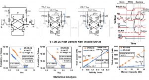 - NV-SRAM: Static Random-Access Memory (SRAM) technology is the enabler of advanced CMOS logic technology scaling and has significant implications on continuation of Moore’s law. Lower bitcell-leakage necessitates use of higher VT transistors which leads to higher active-Vmin (operating voltage). Therefore, there is a critical need to develop a unique SRAM technology which can decouple VT (for lower leakage) and active-Vmin constraints with zero area overheads. In this research we propose 6T-2R-2S (R= RRAM, S= Selector) SRAM bitcell featuring in-situ state retention, zero standby leakage, high density bitcell with no active area growth, decouple VT and Vmin design trade-off and heterogeneous integration of RRAM and selector devices using backend of the line (BEOL) process steps onto a baseline 6T SRAM CMOS design, VLSI-TSA 2019 [Paper].