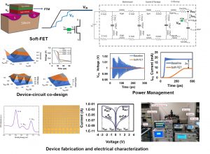 - Soft-FET:Voltage droops caused by the peak switching current as well sudden changes in current activity (di/dt) of various logic blocks results in IR drop as well as package inductance noise. This voltage droop attributes to a significant portion of the operating voltage specifications. In this research, we demonstrate energy efficient CMOS circuits using soft-switching transistors utilizing abrupt phase change in transition metal oxides (such as VO2). We propose a novel transistor architecture abbreviated as “Soft-FET”. By placing an optimized phase transition material in series with the gate terminal of a baseline MOSFET, its switching behavior can be smoothed out to reduce the peak current consumption, DAC 2018 [Paper].