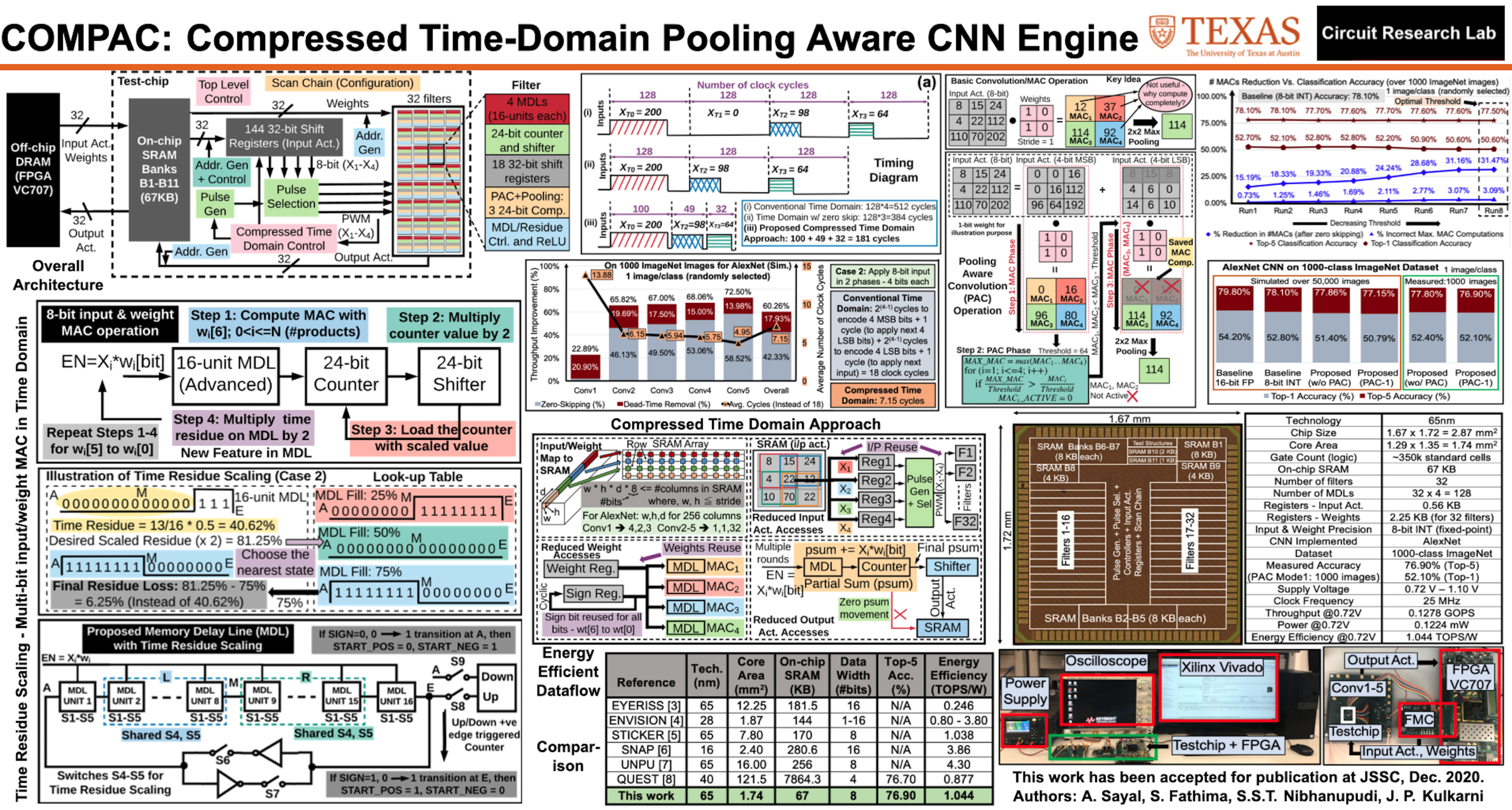 - COMPAC CNN Hardware Accelerator: In this work, a compressed time-domain, pooling aware convolution (COMPAC) CNN engine for an energy-efficient edge AI computing is demonstrated in 65nm CMOS technology. Four major ideas are proposed in this work which results in better performance, accuracy, and overall energy efficiency. The proposed COMPAC CNN engine supports time residue scaling (TRS) in the memory delay line (MDL) to perform an energy-efficient multi-bit input and weight MAC operation in the time-domain, while still achieving high classification accuracy. A compressed time-domain (CTD) approach is proposed and deployed in COMPAC to improve throughput in time encoding of the input activation. The simulation results on the AlexNet CNN over 1000 ImageNet images show a significant throughput improvement; consuming on an average, 14.71 and 7.15 input clock cycles to time encode an 8-bit input activation in two different compressed time-domain modes. Pooling Aware Convolution (PAC) technique is proposed to reduce the number of MACs. The simulation results on the AlexNet CNN over 1000 ImageNet images show up to 31.47% (21.79%) reduction in the number of non-zero input activations MACs with a top-5 classification accuracy loss of 0.60% (0.90%), top-1 classification accuracy loss of 2.20% (1.90%), and an on-chip access overhead of 60.53% (8.03%) for the PAC modes 1 (2) respectively. The trade-offs between classification accuracy, reduction in the number of MACs, and on-chip access need to be carefully comprehended to achieve optimal overall energy savings. An energy-efficient data flow for optimal on/off-chip memory accesses is also discussed in this paper. COMPAC data flow results in 86.97% reduced on-chip SRAM accesses and 29.74% reduced off-chip DRAM accesses compared to an Eyeriss, considering iso 8-bit precision. 65nm CMOS test-chip implementing the AlexNet CNN achieved an energy-efficiency of 1.044 TOPS/W, throughput of 0.1278 GOPS at 720mV while operating at 25MHz. The top-5 classification accuracy of 76.90% measured over 1000 ImageNet images, and 77.15% by simulating over 50,000 ImageNet images is achieved with the proposed COMPAC approach. The simulation results taken into account MDL circuit non-idealities over 50,000 ImageNet validation set images, show a classification accuracy loss within 1% when compared to the 8-bit fixed point software implementation.