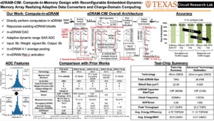 - eDRAM-CIM CNN Hardware Accelerator: In this work, a 1T1C eDRAM compute-in-memory engine is demonstrated in 65nm CMOS technology by repurposing 1T1C eDRAM columns as charge domain circuits to perform DNN computations. The key features are 1) support of in-eDRAM DNN analog computations: such as data conversion, dot-product, averaging, pooling, and rectified linear unit (ReLU) activation; (2) support for 8b input and 8b signed/unsigned weight multiply-accumulate-averaging (MAV) operations; (3) a modified WL controller to configure some of the 1T1C eDRAM columns as charge-sharing compute units in CIM mode; (4) performing dot products with non-destructive weight reads, thus avoiding weight duplication, extra control logic and not requiring a pre-initialized array; (5) an in-eDRAM adaptive dynamic-range successive-approximation (SAR) analog-to-digital converter (ADC) using narrow range of dot-product distribution to minimize the ADC latency/energy; and (6) quantify eDRAM- CIM benefits in an advanced eDRAM technology node. [ISSCC Paper] [ISSCC Slides]