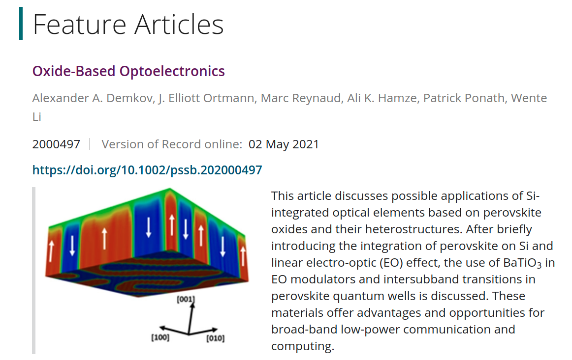 October 28, 2021, Filed Under: Group NewsSica Status Solidi (b) 02 May 2021 Our paper about Oxide-based Optoelectronics reveals the applications of oxides for photonic devices and is selected as feature article on Physica Status Solidi (b) .