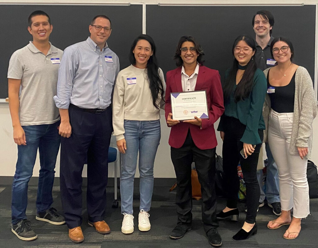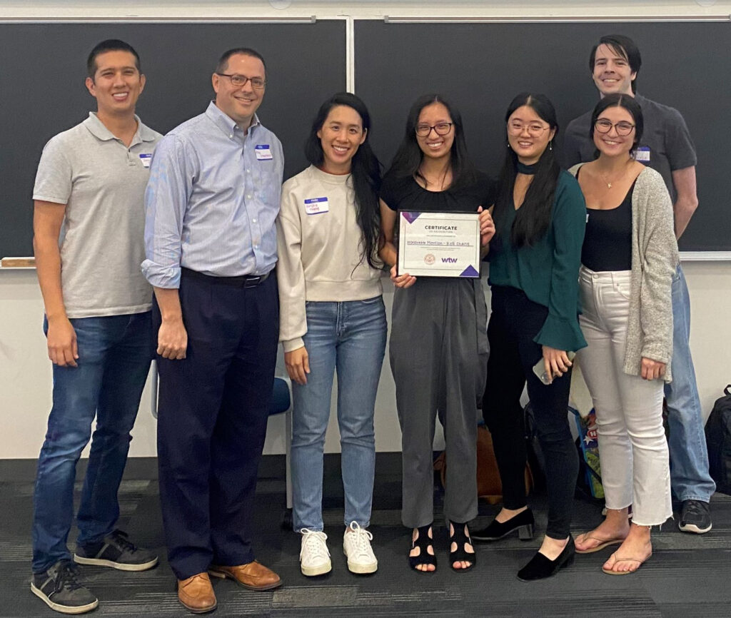 September 13, 2022, Filed Under: Case CompetitionFall 2022 WTW Case Competition Topic – Retirement Benefits Thanks to our judges! Kayla BerryDean CrawfordJesus FloresMatt KruszChristy TrangCatherine Zhang 1st Place: Pink Team Chenhui YangAmanda YinWenting Lu Ian McIntosh (not pictured) 2nd Place: Black TeamRajshree GaneshRachel NudelmanEmily LaiDevin BlytheLuoqun Wang Honorable Mention: Individuals Kelli ChangCarter GoetzDiana Klein (not pictured)Kaushal PatelMahek Sansi Case Competition Current CompetitionUpcoming CompetitionPast Winners Resources Department of MathematicsCollege of Natural SciencesBe An Actuary American Academy of Actuaries Student Resources