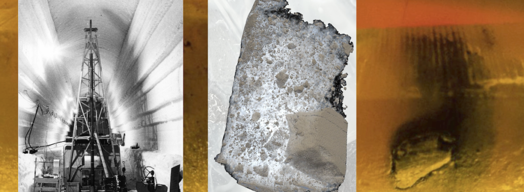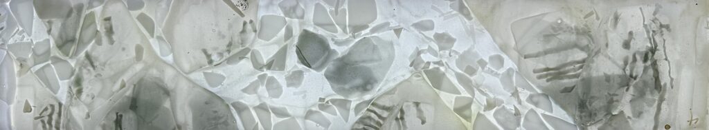 Greenland’s Ice Sheet Between Melt and Memory Between Melt and Memory is a collaborative work between Francesca Samsel and Benjamin Keisling, an artistic perspective on research into the history of Greenland’s ice sheet. Video Link Tracing the Greenland Ice Sheet’s ice divide from the melting margins to its two‑mile‑thick summit 700 kilometers inland, Between Melt and Memory invites viewers to the in-between where geologic memory meets scientific foresight. The immersive, multi-sensory exhibition featuring glass and clay sculpture and projected visuals invites viewers to encounter the complexities of climate change through tactile forms, connection to the research sites and images from below the ice sheet. Based in scientific observations, here data are transformed via an artistic voice providing the opportunity for viewers to explore through science and metaphor while reflecting the changes within this fragile landscape. One method of determining when an area was last ice-free is by measuring the cosmogenic nucleotides. Fused glass rendering of ice cores, part of the interactive section of the work. The 3 sites This work highlights three sites where subglacial materials including sediment-rich ice, sediment, and bedrock have been recovered, enabling scientists to document when different regions were last ice-free. The sites traverse from the thin margin of the ice sheet (Prudhoe Dome, ice-free 7,000 years ago), following the ice divide inland (Camp Century, shown here, ice-free 430,000 years ago) to its highest and thickest point at the summit (GISP2, ice-free one million years ago). By studying these materials in combination with numerical models, we can determine the climatic thresholds that drove past ice-sheet retreat, enabling us to better predict the ice sheet’s future behavior. Camp Century where bedrock was drawn from below the ice sheet in the 1960’s. About Between Melt and Memory Forty percent of Earth’s population lives within one hundred kilometers of the coast, concentrating lives, cultures, and infrastructure in regions most exposed to rising seas. Between Melt and Memory invites viewers into the in-between space where geologic time meets scientific foresight—where the deep memory of ice and sediment intersects with the tools that allow us to glimpse possible futures. The work offers an encounter with climate science not as abstraction, but as material, sensory experience. At its core, the installation traces the spine of Greenland’s ice sheet, from the thinning, melting margins near the ocean to its two-mile-thick summit some 700 kilometers inland. Scientific methods reveal that this immense body of ice has been far smaller in the past, responding to prolonged warmth over millennia. Subglacial matter becomes data, becomes model, becomes image, and finally becomes felt experience. This work translates isotopic records and computational simulations into visual and tactile languages that mediate between scientific models, display systems, and public understanding. Fused glass mimicing the patterns in the ice and sediment cores Digitally rendered projections of ice, terrain, and modeled processes are paired with interpretive objects formed from the materials of the Earth itself—glass, (above) silica and mantle. These tactile artifacts echo the ice and sediment cores that scientists extract to read Greenland’s history. Viewers encounter both the immaterial precision of computation and the physical weight of matter shaped by the human hand. Together, they create a multisensory environment in which knowledge is not only seen, but touched and felt. Driving the work is a concern about the accessibility of climate science. The processes by which knowledge is created—sampling, modeling, simulation—often remain opaque to the public, even as their implications shape the future of habitability. Between Melt and Memory melds scientific artifacts with artistic transformation to provide pathways into this complexity. It does not ask viewers to master the data. Instead, it offers entry through curiosity and wonder, acknowledging that not all facts must be present to begin contemplating responsibility and change. At each of three sites, scientific analysis of ice, sediment and rock reveals the last time these ancient materials saw the sun – meaning the ice was smaller than today: at Prudhoe Dome, 7 thousand years ago; at Camp Century, 430 thousand years ago; and at the Summit, one million years ago. Closest to the coast at Prudhoe Dome, the relatively recent exposure of these materials tells us with a high degree of certainty that the ice sheet receded by ~10% in response to limited high-latitude warmth. As we traverse deeper inland to the other sites, our knowledge becomes less certain—yet these sites tell of times when the ice sheet was much smaller or even absent. If warming continues, such states become plausible. That risk motivates continued scientific innovation and the application of high-performance computing to unravel the mysteries these ancient archives encode. The installation becomes an in-between realm connecting Greenland’s geologic past to near-future sea-level realities, mediated by the viewer’s own perceptions and lived experience. As attention turns toward Greenland while we discuss ownership, the seas continue to rise. In this documentation, the work is displayed across 24 8K monitors in the TACC Visualization Lab. For the SIGGRAPH Gallery, the same presentation is proposed through immersive projection, enveloping viewers within this space between melt and memory. The Research Underpinning