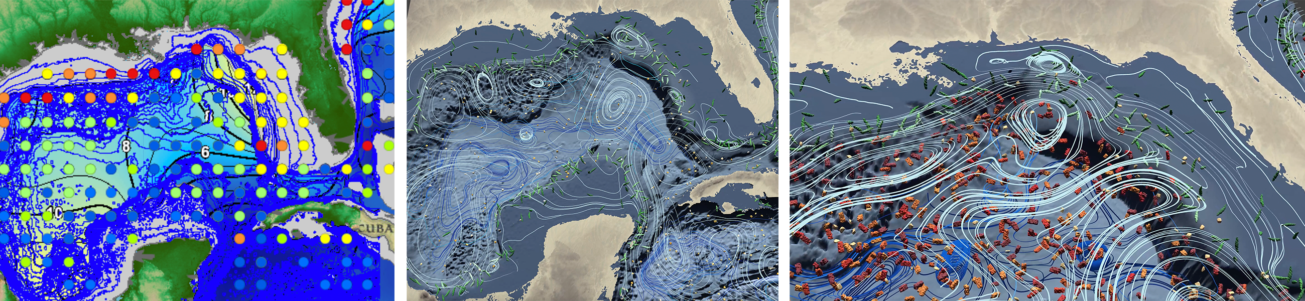 Gulf of Mexico Biogeochemistry Data & Science from Phil Wolfram and Mathew Maltrud as part of the ARPA-E Project at LANL, E3SM PROJECT DESCRIPTION We work in close collaboration with climate modelers at Los Alamos National Laboratory on a number of projects. One such ongoing project studies the biogeochemistry of the Gulf of Mexico in order to determine where algal blooms have occurred in the past and may occur in the future as the climate rapidly shifts. Marine macroalgae in the Gulf of Mexico is an important potential source for biofuel. However, identifying locations with the correct biogeochemical and hydrodynamic conditions for cultivation on a large enough scale to meet the needs of the U.S. private energy sector is impossible from purely observational studies. Large-scale, HPC modeling of earth systems processes enables researchers to study complex physical relationships with high fidelity. Here, we present novel visualization techniques showing the results of a global run of the E3SM’s MPAS-Ocean model data with biogeochemistry extensions to improve ongoing research in macroalgae cultivation. We use our Artifact-Based Rendering (ABR) tool to visualize this simulation data in three dimensions with unique glyphs, streamlines, colormaps and textures, allowing scientists to better recognize and study relationships between these many interdependent variables in space. Above, the image on the left is the typical method used to visualize this type of data. The images on the right contain the same information as well as the three-dimensional distribution of the nitrates, chlorophyll, and other variables co-located in space. We would like to thank Mathew Maltrud, Mark Petersen, and Zhendong Cao for assisting with core science questions. This research was partially funded by the National Science Foundation under awards IIS 1704604 and IIS 1704904 and by ARPA-E Funding Opportunity No. DE-FOA-0001726, MARINER Award 17/CJ000/09/01, Pacific Northwest National Laboratory, prime recipient and the Laboratory Directed Research and Development program of Los Alamos National Laboratory under project number 20200065DR. ASSOCIATED PUBLISHED ARTICLES & VIDEOS Supercomputing 2022: Article ASSOCIATED VIDEOS