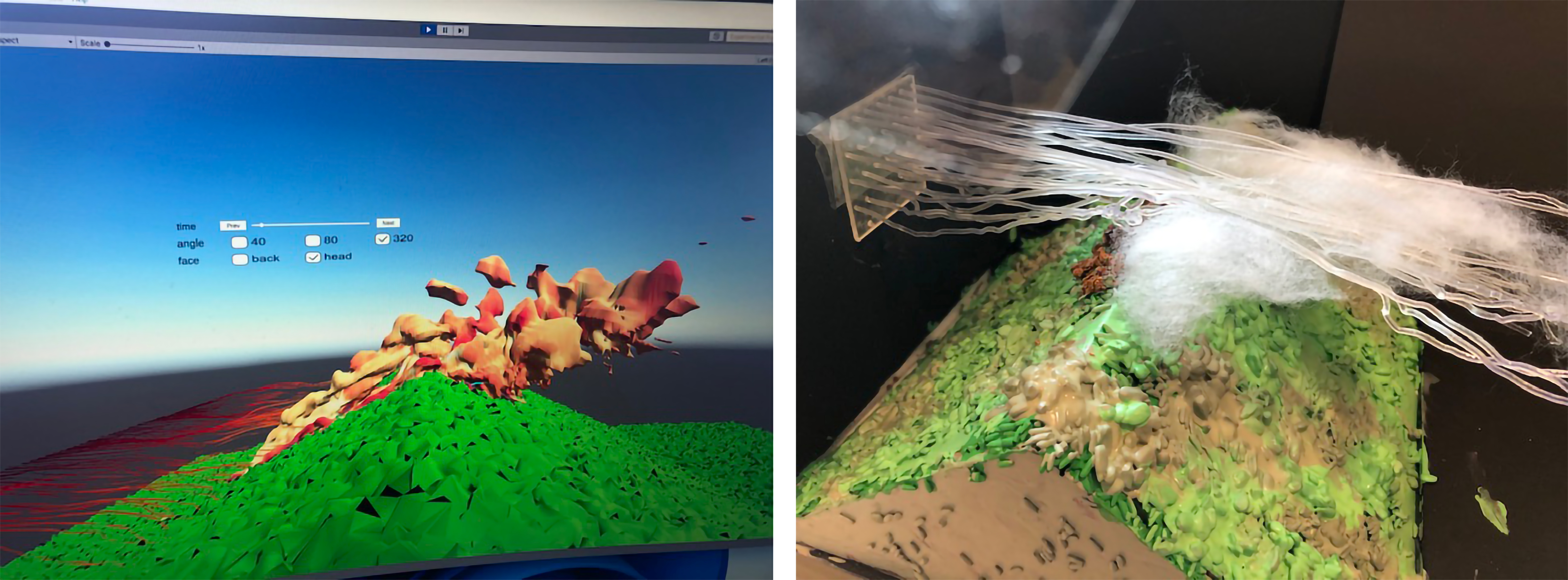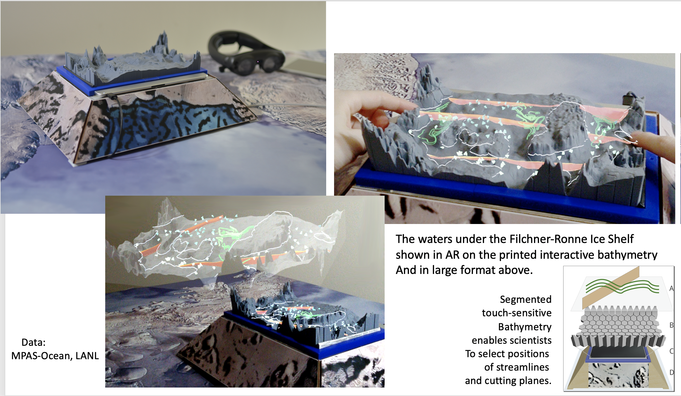 Physicalization PROJECT DESCRIPTION AR, VR, Physicalization & Interaction One of the vislab’s primary thrusts is the intersection of augmented reality, virtual reality, physicalization, and interactivity. As computing capacity continues to advance, accessibility to big data is also improving. This broadens the potential for visualizations that move beyond two-dimensional screens and into the embodied, physical world. Significant research has demonstrated that tactile and three-dimensional visualizations improve memory, comprehension, and learning potential, especially in lay audiences. We are working to explore these promising avenues for visualization through tightly integrated digital + analog methodologies. Virtual Reality The image above shows a demonstration at the Texas Advanced Computing Center’s Visualization of the use of virtual reality to view and explore a three-dimensional, multivariate visualization of the Gulf of Mexico, encoded using hand-crafted glyphs and colormaps in the Artifact-Based Rendering system. Here, PI Francesca Samsel and graduate student Claire Fitch assist Michael Dell as he explores the visualization in the VR headset. Augmented Reality Physical visualizations, or physicalizations, are useful for many tasks such as communication and display, but are often insufficient as research tools without the addition of some sort of digital element. We are therefore working to integrate augmented reality components with aspects of the physical world in order to broaden their potential for research-oriented use, such as data exploration, interrogation, and group science. This project explores how data physicalizations (3D printed terrain models, anatomical scans, or even abstract data) can naturally engage both the visual and haptic senses in ways that are difficult or impossible to do with traditional planar touch screens and even immersive digital displays. The rigid 3D physicalizations produced with today’s most common 3D printers are fundamentally limited for data exploration and querying tasks that require dynamic input (e.g., touch sensing) and output (e.g., animation), functions that are easily handled with digital displays. We introduce a novel style of hybrid virtual + physical visualization designed specifically to support interactive data exploration tasks. Working toward a “best of both worlds”solution, our approach fuses immersive AR, physical 3D data printouts, and touch sensing through the physicalization. We demonstrate that this solution can support three of the most common spatial data querying interactions used in scientific visualization (streamline seeding, dynamic cutting places, and world-in-miniature visualization). Finally, we present quantitative performance data and describe a first application to exploratory visualization of an actively studied supercomputer climate simulation data with feedback from domain scientists. Physicalization Incorporating physical components into research practice provides numerous benefits, including expanded avenues for bringing artists and members of the lay public directly into the visualization process. In the image above shows a series of layered pieces of plexiglass, laser-engraved with layers of Gulf of Mexico bathymetry and scattered with beads, wires, and other material components showing the general flow of water and other particles. Physical objects provide opportunities to integrate artistic practice with research praxis and visualization production. ASSOCIATED PUBLISHED ARTICLES Multi-Touch Querying on Data Physicalizations in Immersive AR