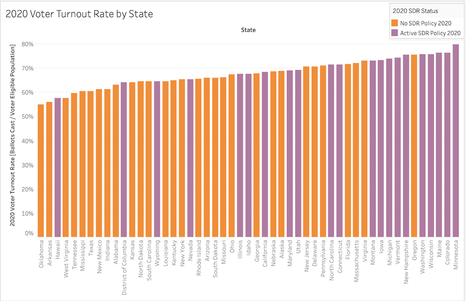 In the 2020 presidential election, 20 states and the District of Columbia had active same day voter registration policies. Additionally, New Mexico had passed legislation but not yet implemented the policy. These states contributed to the 2020 election having the highest voter turnout rate since 1900; 9 of the 10 states with the highest voter turnout rates allow same day voter registration. On average, the states holding same day voter registration policies had a turnout rate of about 71 percent, while states without them had an average turnout rate of 65.5 percent.