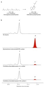 The cyclases in this pathways are ancestral to a dipternoind, present in modern plants! Heterologous expression of them revealed they cyclize geranylgeranyl pyrophosphate to form bicyclic halimadienyl pyrophosphate.