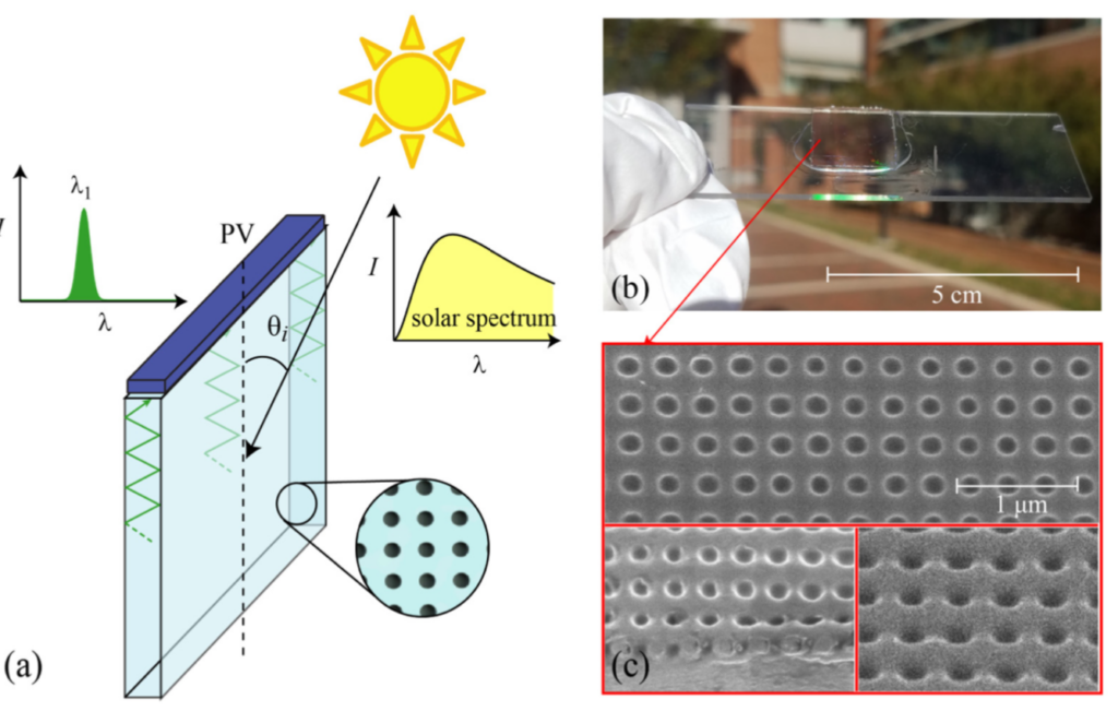 In addition to the antireflection effects, photonic nanostructures can also be used to trap light. We are investigating the use of such nanostructures on a glass window to re-direct and concentrate ambient sunlight to the edge, where it can be captured by a solar cell (as shown above) [1]. This effectively functionalizes windows are solar harvesters, which can serve as a building energy source. The nanostructures can also selectively trap a certain color wavelength, enabling spectra splitting to bandgap-matching solar cells. We have demonstrated 2% energy conversion efficiency, which can be improved by optimizing for structure geometry. These structures can be applied to existing windows and can be one aspect of the progress towards zero-emission buildings.