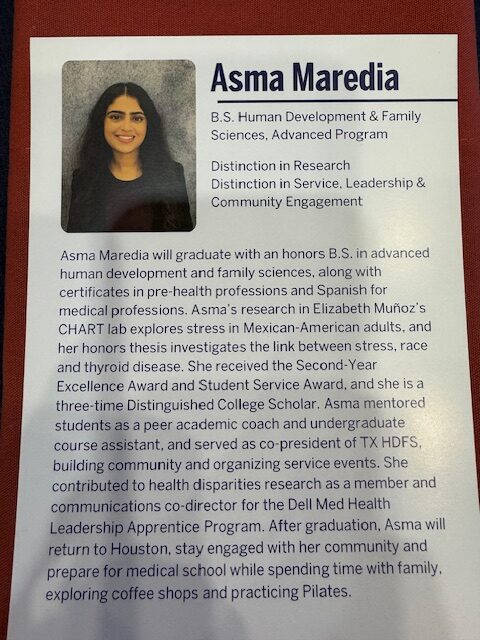 News & Events 9/22/25 – Jordana Breton Receives Hispanic Neuropsychological Society Student Research Award Congratulations to CHART Lab graduate student Jordana Breton on receiving the Hispanic Neuropsychological Society’s Student Research Award, which provides support for cross-cultural research, Spanish language testing, and conference travel. 8/27/25 – CHART Lab Graduate Students Recognized by the Gerontological Society of America Congratulations to CHART Lab graduate students Jordana Breton and Hyun Moon on receiving multiple awards from the Gerontological Society of America, including ESPO Poster Awards and Student Travel Stipends, in recognition of their outstanding research! 7/23/25 – Congratulations, Dr. Jean Choi! Congratulations to Dr. Jean Choi who successfully defended her doctoral dissertation entitled “Life Course Stress Exposure and Cognitive Function: The Roles of Chronic Inflammation and Neighborhood Context.“. 4/27/25 – New Publication by Lourdes Romañach Congratulations to Lourdes on her first-authored publication entitled “Neighborhood Social and Physical Environment and Cognitive Function among Brazilian Adults Aged 50+”. See the online publication here 5/10/2025 Congratulations Class of 2025! Congratulations to undergraduate research assistants Brianna Phan (B.S.A.), Dottie Trevino (B.S.A.), Bella Fayad (B.S.), Asma Maredia (B.S.), and Isabelle Vivas (B.S.) who graduated with their Bachelor’s degree in HDFS! 5/9/25 – Asma Maredia named Dean’s Honored Graduate! Congratulations to CHART member Asma Maredia who will graduate with the highest honor from UT Austin’s College of Natural Sciences. You can read more about this award here. 4/30/25 – Bella, Asma, and Isabelle present honors theses Congratulations to undergraduate students, Bella Fayad, Asma Maredia, and Isabelle Vivas for successfully completing and presenting their honors theses. “Examining the Effects of Educational Attainment, Perceived Stress, and Acculturation on Hippocampal Volume in Mexican American Adults” by Bella Fayad “Under Pressure: The Role of Race in the Stress-Thyroid Disease Connection” by Asma Maredia “Acculturation, Time in the U.S., and Cardiovascular Disease Risk: Understanding Health Outcomes Among Older Mexican American Adults” by Isabelle Vivas 4/16/25 – Congratulations Lourdes Romañach! Congratulations to Lourdes Romañach for being awarded an NICHD Ruth L. Kirschstein National Research Service Award – Pre-Doctoral Training Fellowship from UT Austin’s Population Research Center! Read more about this opportunity here. Texas Alzheimer’s Research and Care Consortium (TARCC) Scientific Symposium Jordana Breton presented at the TARCC Scientific Symposium! Her poster was entitled “Acculturation moderates the relationship between stress appraisal and memory: Results from the Health and Aging Brain Study-Health Disparities Study (HABS-HD).” CHART at the Gerontological Society of America’s 2024 Annual Scientific Meeting CHART traveled to Seattle to attend GSA’s 2024 Annual Scientific Meeting. Jean Choi, M.A. presented her talk entitled “Cumulative Stress Exposure, Neighborhood Environments, and Inflammation” and Lourdes Romañach Álvarez presented her poster entitled “Neighborhood Environment and Cognitive Function Among Older Adults in Brazil.” CHART at 2024 ICAA CHART was well-represented at the 2024 International Conference on Aging in the Americas (ICAA). Congratulations to Zoe Garcia and Lourdes Romañach Álvarez on their poster presentations, and to Jean Choi on her Lighting Talk presentation! You can find a copy of the conference program here. (Pictured from left to right: Jean, Zoe, Lourdes, Hyun, Jordana) 8/29/24 – 8/30/24 Identifying Midlife Social Exposures that Might Modify Risk for Cognitive Impairment Associated with Early Life Disadvantage Dr. Muñoz will present at an upcoming two-day public workshop at the National Academies of Sciences, Engineering, and Medicine to discuss the state of knowledge and identify conceptual approaches to guide research on better understanding midlife exposures that may be modifiable in reducing the risk of later-life dementia. This workshop is being supported by the National Institute on Aging. You can register for in-person or virtual attendance here: https://www.nationalacademies.org/event/43209_08-2024_identifying-midlife-social-exposures-that-might-modify-risk-for-cognitive-impairment-associated-with-early-life-disadvantage 7/26/24 Congratulations Jean Choi! Jean Choi who was selected to participate in the Comparative Life Course Methods Workshop sponsored by the National Institute on Aging. This is a competitive opportunity for mentorship and training in Best Practices of Comparative Life Course Research, using large-scale cohort studies from around the world. Congratulations! 6/4/24 Dr. Muñoz selected as Fellow of the Gerontological Society of America Fellow status is peer recognition for outstanding contributions to the field of gerontology and represents the highest category of membership. You can read the announcement here. 4/19/24 Brianna Phan presents research project Research assistant, Brianna Phan, presented her research at the CNS Undergraduate Research Forum. Her poster was titled “Examining the link between stress and cardiovascular disease in relation to maladaptive coping behaviors and socioeconomic status”. Congratulations, Brianna! Community Engagement CHART partners with local no-profits to provide health promotion resources to the Austin adult community on a bi-weekly or monthly basis. Check out this picture of some of us at Del Valle High School in August 2023. (Pictured from left to right: Ignacio, Zoe, Lourdes, Dr. Muñoz) WELCOME! Welcoming graduate student, Lourdes Romañach Álvarez (left), and project manager, Zoe Garcia (right), to CHART! (Pictured from left to right: Lourdes, Jean, Zoe) 6/15/23 New Publication by Jean Choi Congratulations to J