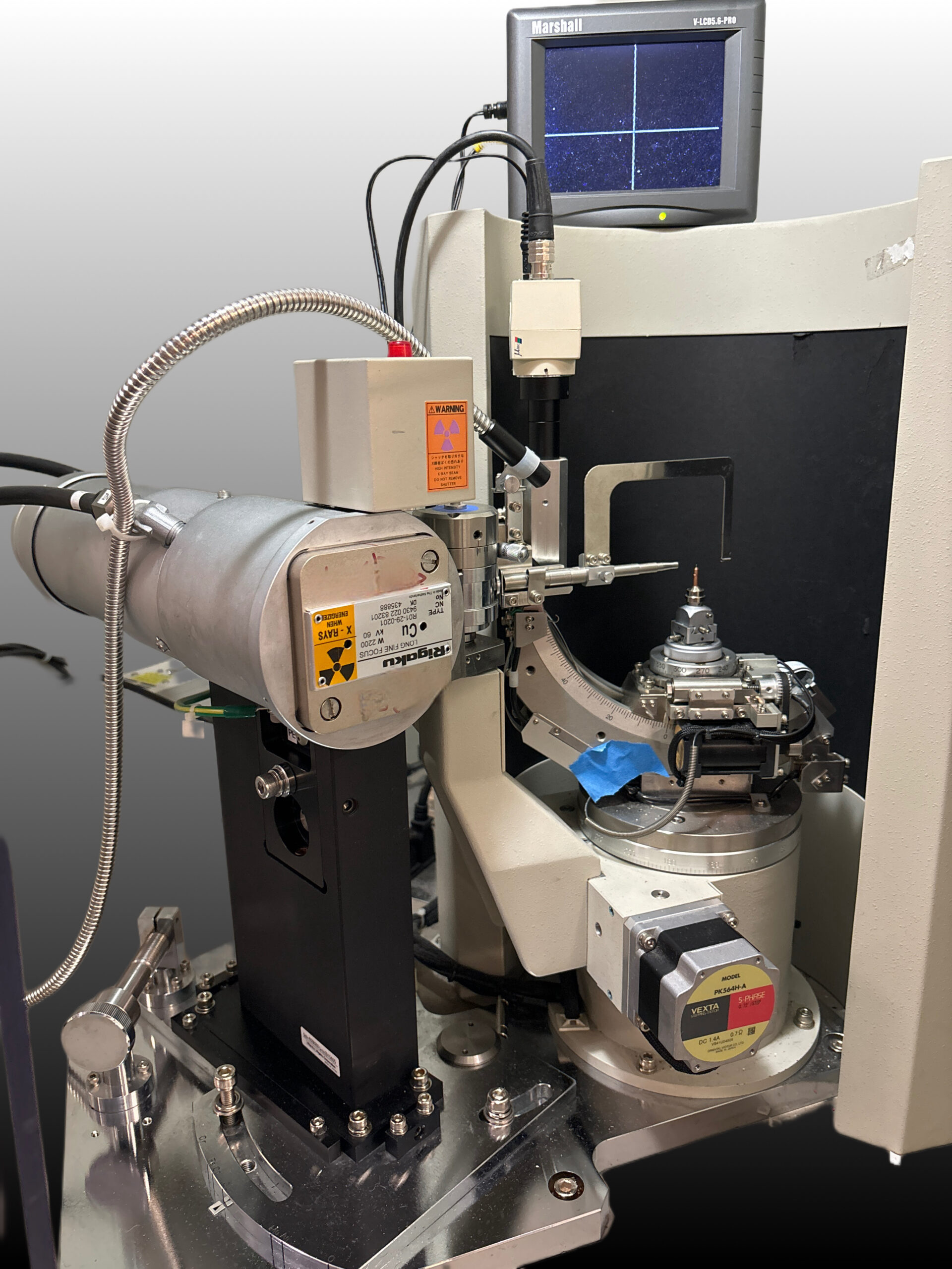 Rigaku R-Axis Spider is equipped with a Cu sealed tube source with a large, image plate detector. This instrument is very versatile. It can be used for powder diffraction on loose powders and thin films and also for single crystal data collection. It uses a point focus Cu source with the SHINE curved graphite monochromator. It produces an X-ray beam ~0.5 mm in diameter. A diffraction pattern can be obtained in a short time using a fraction of the sample needed on a conventional powder diffractometer. Thin film data can also be acquired in a short time. Because a large, curved image plate detector is used, a very wide 2θ range can be analyzed in a short time. Because no post diffraction optics are employed, peak broadening can be an issue. Standards are available to correct for instrumental broadening.