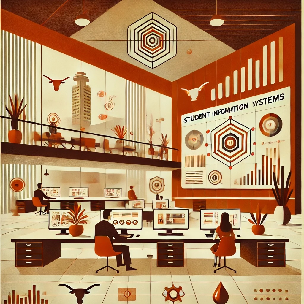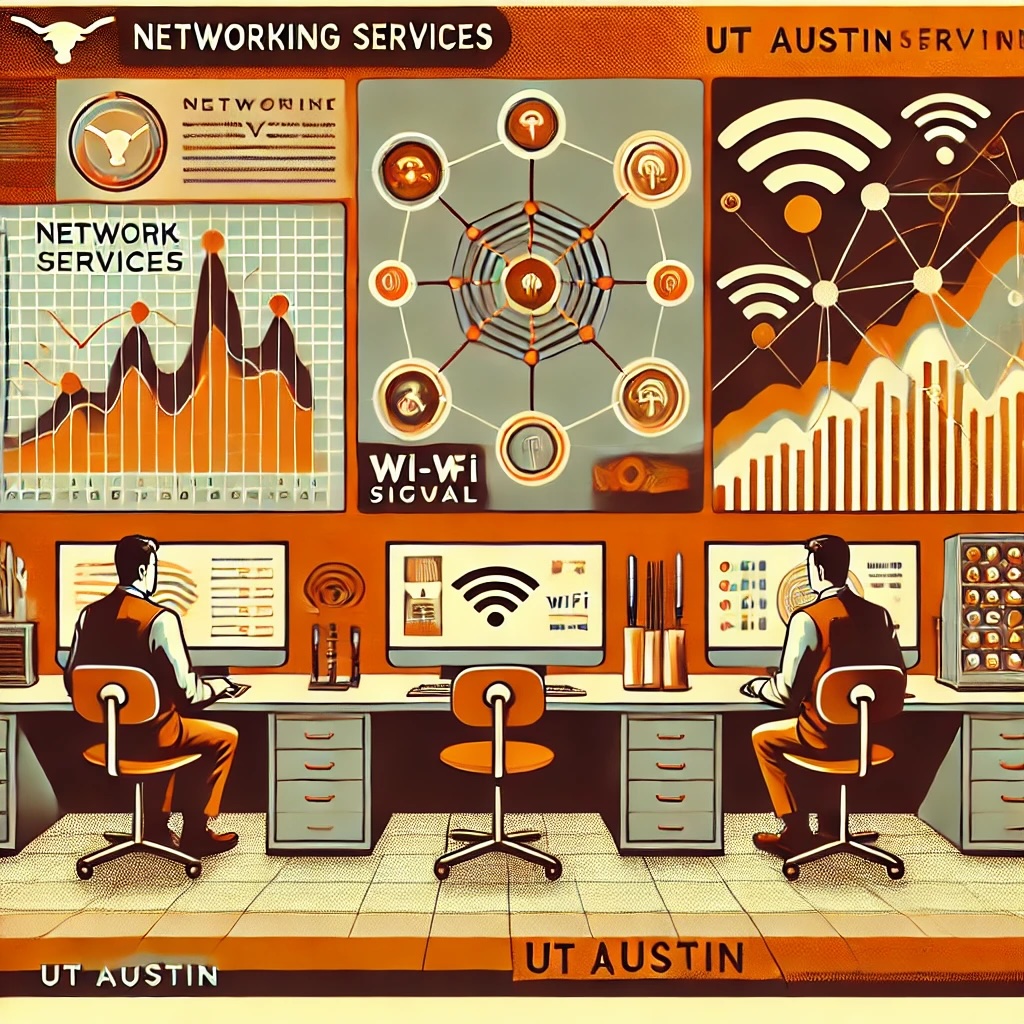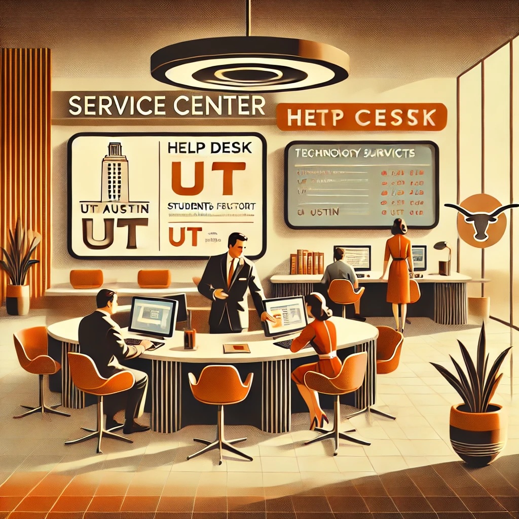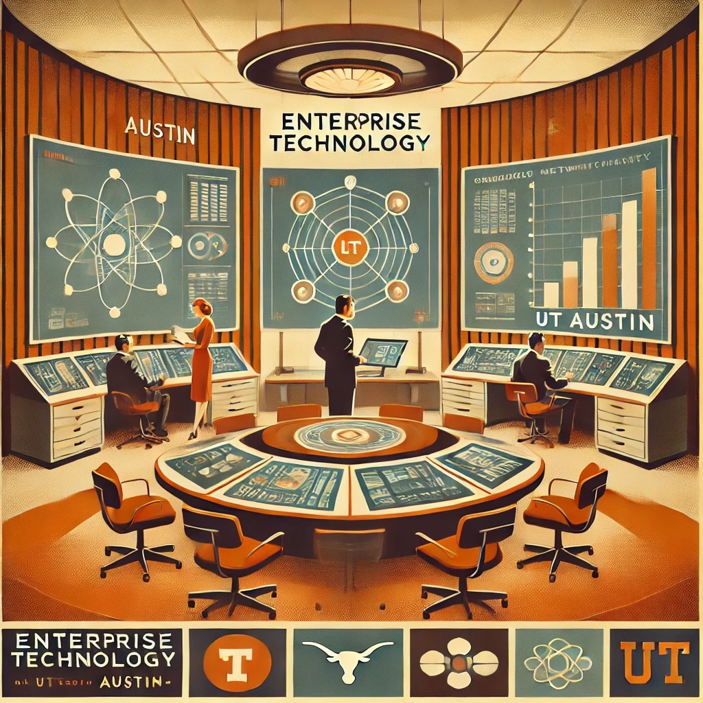 I am not sure what it is about the UT brand that makes me think about the mid-century modern aesthetic. Maybe it is the overall color palette, or some of the rooms I have seen while working in Main. Whatever it happens to be, I really like the vibe of these images that I generated while working on a presentation. I needed some images that spoke to the overall scale of our work and for some reason the AI chose to zero in on this look. I used DALL•E to describe a bunch of styles, but when I stumbled onto this look and feel, I asked it to make one for each part of our org. I love the Mad Men vibe that some of them throw off.