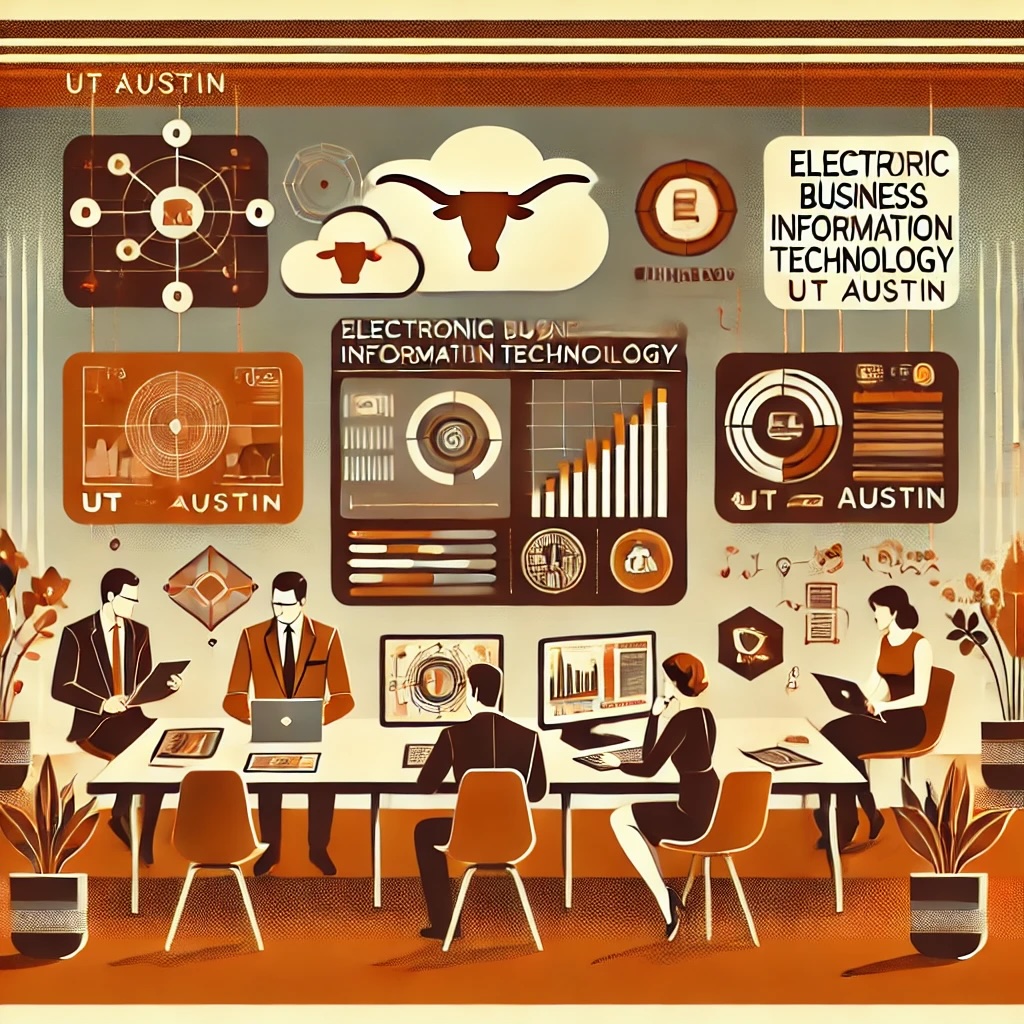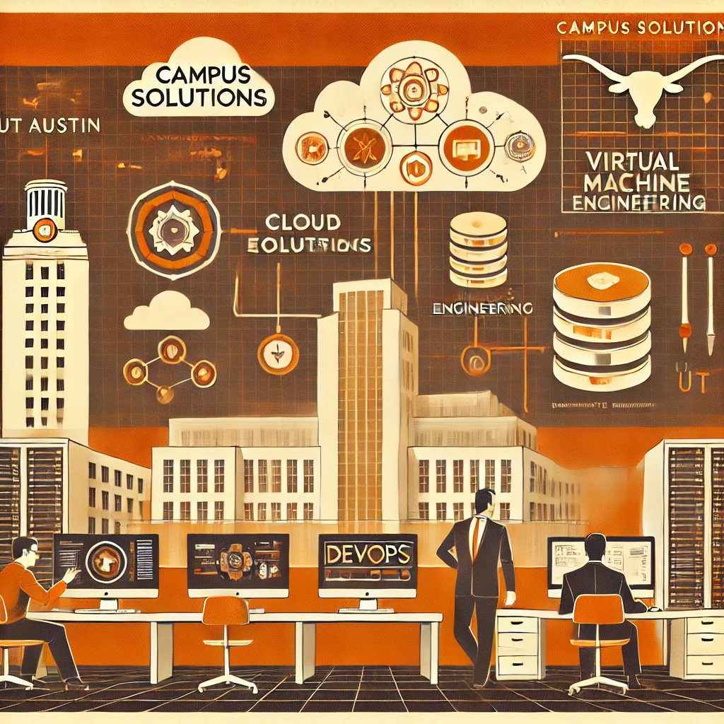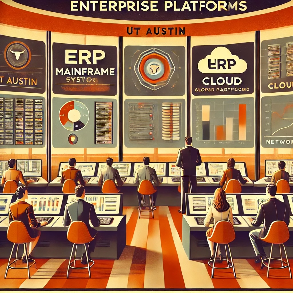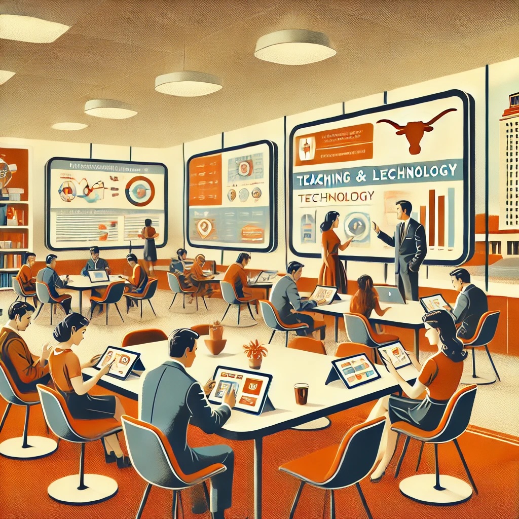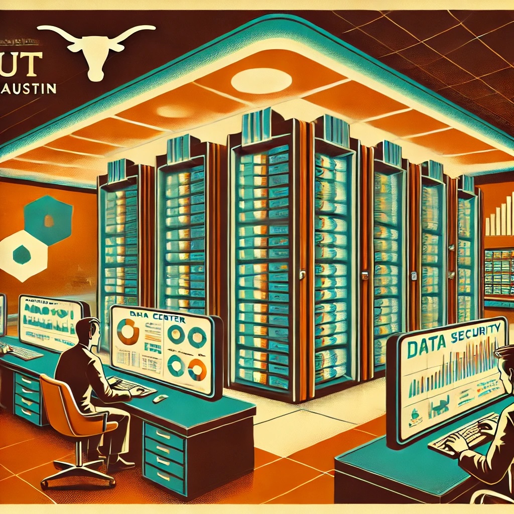 I am not sure what it is about the UT brand that makes me think about the mid-century modern aesthetic. Maybe it is the overall color palette, or some of the rooms I have seen while working in Main. Whatever it happens to be, I really like the vibe of these images that I generated while working on a presentation. I needed some images that spoke to the overall scale of our work and for some reason the AI chose to zero in on this look. I used DALL•E to describe a bunch of styles, but when I stumbled onto this look and feel, I asked it to make one for each part of our org. I love the Mad Men vibe that some of them throw off.