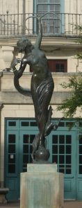 The Mermen in the fountain are anthropomorphic figures which are controlling sea horses, known as Hippocampi (Gr. Hippo = horse + campi = sea monsters). In ancient Greek and Roman art, the hippocampi were traditionally depicted as half horse/half fish creatures pulling the chariot of the Greek god of the sea, Poseidon. Instead of the horses which pull the quadriga of Nike, Coppini has replaced them with hippocampi to emphasize the discovery of America and the United States’ power being via the sea.