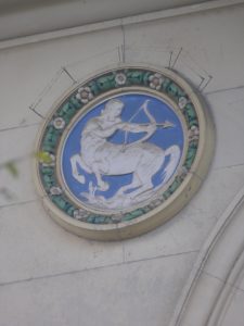 Above each of the windowed balconies on Battle Hall are a series of medallions with images representing the signs of the Zodiac. It is important to bear in mind that knowledge of the Zodiac signs was not connected with the kind of mundane prophetic statements associated with reading one’s horoscope. For centuries, the Zodiac was understood as the movement of different constellations of stars whose position in the night sky indicated the passage of time and was used as a means of navigating. Knowledge of these constellations was also a fundamental part of medical education from the inception of medical universities in Italy. Greek myths were often associated with these constellations.