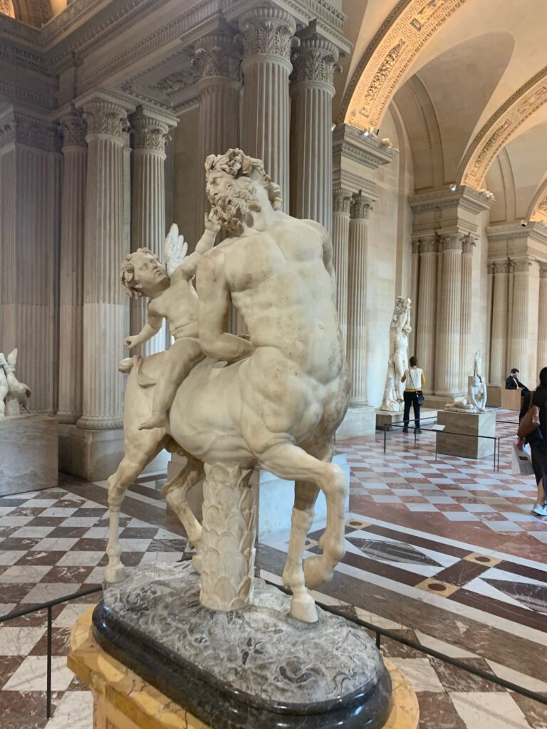 One of my former students sent me some pictures of the mythological artwork that she encountered on her visit to the Musée du Louvre in Paris. This marble statue of Eros (Roman Cupid) and a Centaur is one of pieces of Greco-Roman artwork that caught her attention. This famous statue is believed to be a 2nd-century-AD, Roman copy of Greek statue by a sculptor of Aphrodisias. It is a good example of a piece of Greco-Roman artwork for which there is no myth in Greek and Latin literature that we can used to interpret this statue. Therefore, it is unclear as to why the centaur’s hands appear to be tied behind his back, and more interestingly, why is Eros teasing this centaur in the first place.