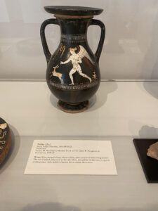 IV. Acquisition: This object was placed on UT’s campus in the Blanton Museum in 1988 as a part of the Archer M Huntington Museum Fund. After originally providing the University with the Diana of Chase statue, Mr. Huntington became infatuated with providing an art venue for the University of Texas and its students. He gave a gift of around $145,000 to start a fund for the cultivation of art around campus. This gift ultimately laid the foundation for the Art Building where the Archer M. Huntington Gallery was originally housed (“A Vision”). As an eventual addition to this collection through the Huntington fund, the Pelike of Eros chasing a fawn is not the grandest piece of the collection or most recognizable, but it demonstrates the ever present impact of love and desire on innumerable myths to the student audience. Though primarily known because of the great love story of Eros and Psyche, simply depicting Eros with a fawn simplifies and broadens the scope of the Olympians’ impact and possible interpretations.