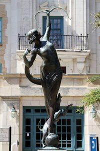Between the South Mall and W. 21st street stands the iconic Littlefield Fountain ( Google Maps ). Since its completion in 1933, Littlefield Fountain has been the most widely recognized statuary on UT’s campus. It is a powerful amalgamation of Greek iconography that have been appropriated to create a World War I monument. It was carried out by Pompeo Coppini, an Italian-born sculptor living in San Antonio. He depicted Columbia , the symbol of the American spirit, standing on the bow of a ship being pulled by three sea horses. Behind her are two soldiers one representing the Army and the other the Navy. By depicting Columbia traveling victoriously across the waters in her defense of liberty, Coppini intended the sculpture to create an image of a strong, unified America.