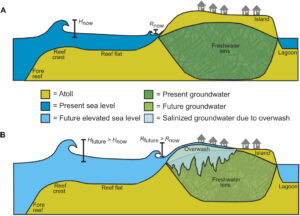 Furthermore, low islands do not typically have large fresh water reserves or pools to support them, relying instead on regular rain capture as regular water supply. Those islands that are lucky enough to have fresh water reserves may find them endanger of seawater contamination from rising sea levels or storm surges. A study sponsored by the USGS found that increased wave activity and wave run up would result in overwash that could contaminate the subsurface freshwater lens.