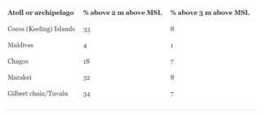While high islands may express mountain ranges or a wide breath of topographical features, low islands rarely rise more than 7 to 8 meters above sea level at their zenith. Because these islands have little topographical diversity, rising sea levels put low lying islands at risk of being ‘passively’ wiped out in the next 100 years. As outlined in Table 1 only about 30% of low islands are 2 meters above mean sea level and less than 10% above 3 meters. If the worst case projections by NOAA are true, sea levels could rise 2 meters by 2100, leaving only 10% of islands above water and likely rendering them uninhabitable.