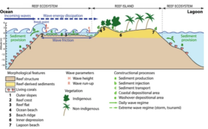 As reefs break down, the impact of wave energy will be even greater. This can be seen in Figure 3, where the reef structure (in brown) will dissipate incoming ocean waves in relation to how long they need to travel in the reef flat (marked three) over the length of the area marked “wave friction.” The longer and more coral-dense the reef, the more energy the wave will lose. As the reef starts to be eroded down, waves will no longer have broken sediment to move lagoonward, nor will the outer shore have the wave reduction protection it needs to keep erosion down. The reef also dissipates energy from large waves during storms, making its conservation important for disaster risk management.