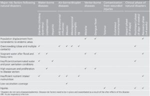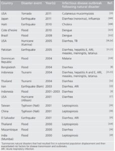 I first need to dispel the notion that climate related disaster immediately puts a population at risk of disease out break. The evidence out there suggest that there is not a strong correlation between a disaster happening and disease immediately breaking out. The concept of mass disease out break immediately following a disaster is often a hyperbole of media. For example, despite the vast number of corpses in Haiti and Japan’s earthquakes did not result in disease outbreak. The microorganisms involved in decomposition are not actually pathogenic in and of themselves.