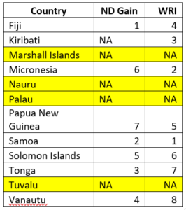 The other discrepancy that we observed during our preliminary study of the indices is the consistency – or lack thereof, in following the methodology. In my next article, I will try to recreate the scores using the Indices’ data and methodology. Retracing the steps, I will explain in detail the discrepancies between the ND Gain and The World Risk Index scores for countries in the Oceania region.