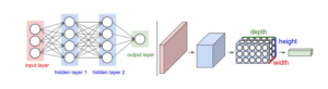 Figure 4. Left: A Typical Neural Network, Right: A Convolutional Neural Network that arranges neurons in three dimensions.