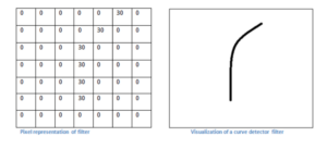 Think of the convolutional layer like a magnifying glass passing over each area of an image. The magnifying glass is our node that assigns weights and does a computation on each part of the image. The magnifying glass slides, or convolves, across the image and runs pixels against a set of filters. Like the precoded data that taught our neural network, CNN filters identify certain features of the data such as corners, curves or edges. As the magnifying glass colvulves across our image, these filters are being run against the pixels and “fire” or pass on classification (for example as a curve, below) if they meet the filter requirements.