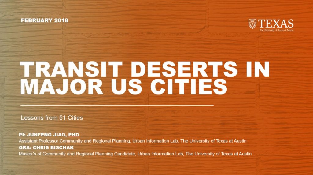 February 19, 2018, Filed Under: UncategorizedDr. Junfeng Jiao Presents Research on US Transit Deserts Dr. Junfeng Jiao, presented his research project about transit deserts, funded by the USDOT University Transportation Centers (UTC) grant, to students and faculty on February 7th during a Department of Architecture Goldsmith Talk. Interested in what areas in cities may be underserved by current transit networks, Dr. Jiao coined the term “transit desert.” A “transit desert” describes an area of a city where transit demand, measured as the transit-dependent population, exceeds transit supply. Jiao aims to further identify, map, and calculate the relationship between supply and demand in 51 major US cities and provide some possible solutions for reconciling this gap as America’s cities grow. Transit deserts are found by finding the difference between transit supply and transit demand at the block group level. The supply is calculated using GTFS (General Transit Feed Specification) data and publicly available GIS data. The demand for transit, while difficult to quantify, found using several Census datasets including household drivers, transit dependent household population, and transit dependent population. Jiao and his research team then subtract the two to calculate the gap that exists at the block group level. Dr. Jiao is an assistant professor in the Community and Regional Planning program at The University of Texas at Austin and director of Urban Information Lab. His research focuses on using information technologies (GIS, GPS, Drone, smart phone, social media, wearable devices, etc) to quantify built environments and understand its impact on people’s behavior (e.g. travel, physical, eating etc) and its health consequence. His research on Transit and Food Deserts were widely reported by the Associated Press, Yahoo, MSN, NBC, NPR, USA today, Finance and Commerce, City Lab, The Conversation, Chicago Tribute, San Francisco Chronicle, LA Times, Seattle Times, Seattle Met, Dallas News, Houston Chronicle, Austin Statesman, Texas Tribune etc.