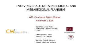 November 9, 2018, Filed Under: UncategorizedCM2 & WTS Webinar: Evolving Challenges in Regional and Megaregional Planning On Friday, November 2nd, CM2 with WTS Southwest Region (Oklahoma, Arkansas, Texas, New Mexico, and Louisiana) hosted a webinar on the “Evolving Challenges in Regional and Megaregional Planning” with presentations from CM2 researchers from UT Austin, TSU, and LSU as well as from the Deputy Executive Director of the Maricopa Association of Governments in Phoenix, AZ. The webinar was a great success, with approximately 80 participants in total from agencies and organizations from around the country (CM2 also hosted a watch party on the UT Austin campus). It was organized and emceed by Lisa Loftus-Otway, M.P.Aff., LL.M., CM2 Assistant Director for Research and a Research Scientist at Center for Transportation Research (CTR) and co-emceed by Ashley McLain, AICP, of Cox McLain Environmental Consulting (a CM2 Support Partner). Ms. Loftus-Otway began the webinar by providing a quick introduction to megaregion theory and an overview of the different working definitions of megaregions. She then introduced the CM2 center and explained how the center is researching critical issues at the megaregional scale. Following Ms. Loftus-Otway’s presentation, the webinar featured the following presentations: Dr. Carol Lewis and Dr. Gwendolyn Goodwin of the Center for Transportation Training and Research at Texas Southern University presented on their CM2 research, “Determining Purpose and Need for Vulnerable Communities in the Megaregion” Dr. Brian Wolshon of the Department of Civil and Environmental Engineering at Louisiana State University presented on his CM2 research, “Evaluation and Analysis of Post-Disaster Re-Entry in Megaregions Project” Amy St. Peter, Deputy Executive Director of the Maricopa Association of Governments in Phoenix, AZ pres ented on “Partnering for Impact in Arizona’s Sun Corridor” The research by Drs. Lewis and Goodwin works to improve the mobility of people and goods in urban and rural communities of megaregions, increase access to opportunity that promote equity in connecting these communities, and develops recommendations for transportation planning agencies. Specifically, the project helps determine purpose and need for vulnerable communities which is a critical requirement for all Environmental Impact Statements (EIS) under the National Environmental Policy Act (NEPA). Dr. Wolshon’s work helps us rethink the way we plan for disaster resiliency in megaregions. His research looks at megaregional evacuation in the face of a natural disaster as well as the impact of a “shadow evacuation” (when people who are not ordered to evacuate or are threatened by effects of evacuation will also evacuate which can clog the evacuation) and re-entry post-disaster. His research shows that evacuation demand models can be scaled up to multi-city travel activities but that there are practical limitations of current tech to simulate megaregional level evacuation. Finally, Amy St. Peter discussed how the Maricopa Association of Governments (MAG) has been partnering for impact in the Arizona Sun Corridor. The Maricopa area was one of the hardest hit areas during the 2008 recession and the fallout caused by residential foreclosures. This, in turn, affected their transportation sales tax revenue, which severely impacted transportation planning and investment. Given the sun corridor’s strategic location for access to key markets. This was a wake-up call for the area that megaregional initiatives were needed. Several megaregional initiatives were undertaken and the area is considered a model for other regions in the country. Following these presentations, there was an excellent question and answer session with our presenters. Some of the major questions included, “How do we get public officials to buy in to the megaregional philosophy?” “How do should professionals outside of the planning realm talk about megaregions?” “How do we win back trust from people who had bad evacuation experiences before?” In terms of getting buy-in from our political officials, our presenters emphasized the importance of, not just including elected officials in the conversation, but always putting the elected officials out front in any of the initiatives as well as creating opportunities for them to build relationships with other elected officials across jurisdictions. In addition, Amy emphasized that having non-planners involved in the conversation of megaregions is absolutely critical. Thinking about megaregions going forward is not just about planning or transportation but about ensuring quality of life for the residents of that megaregion. Dr. Lewis pointed out that a good starting point for these conversation is the regional economy, which effects everyone, and Dr. Wolshon talked about how natural disasters affect everyone regardless of jurisdiction. When it comes to planning for natural disasters, he pointed out, “All the findings we see are scalable. The same concepts tend to hold true, they’re just on different temporal and spatial scales.” Finally, in terms of winning the trust of people who have had bad evacuation experiences, it was pointed out that people choose to evacuate if they feel an imminent threat to their safety, which is influenced by a lot of factors both real and perceived. However, while every event is different in terms of effect (even no two hurricanes are the same), the people affected stay the same so we need to focus our efforts on them. As Dr. Lewis pointed out, the Houston-Galveston Area Council (H-GAC) estimates that, even if everything ran smoothly and not everyone evacuated, it would still take 45-48 hours to evacuate the Houston area. Planning now for the management of evacuation demand is critical to having future evacuations run smoothly, which will help win back trust of the community. Participants in the webinar thanked the pre