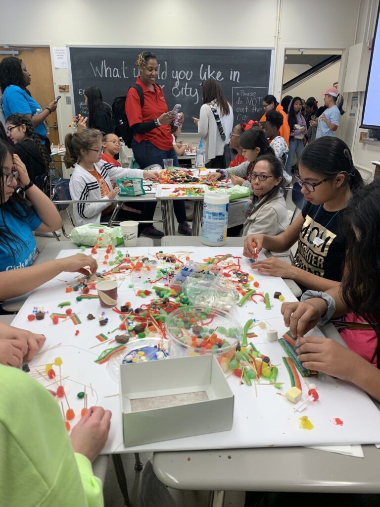 February 24, 2020, Filed Under: News ArticlesBuilding a City out of Candy: Girl Day 2020 On Saturday, February 22 CM2 co-hosted an event at GirlDayUT with the WTS Heart of Texas Chapter. The event is organized to help introduce young girls to STEM professions. CM2 hosted a session called “Building a City out of Candy” which allowed girls to design mini cities out of gum drops, tooth picks, twizzlers, and many other types of candy. Girls toyed with the idea of urbanism and what makes a good city. They constructed parks, bridges, roads, houses, bike paths, among other infrastructure to contribute to a greater city which was placed in the front of the classroom. We want to give a special shout out to those who donated to help us purchase the candy and supplies for our event. Special thank you to COX McLain Environmental Consulting, AECOM, Alliance Transportation Group and Lisa Loftus-Otway for helping make this event possible! We are proud to say that there was a line out door to get into the session most of the day!