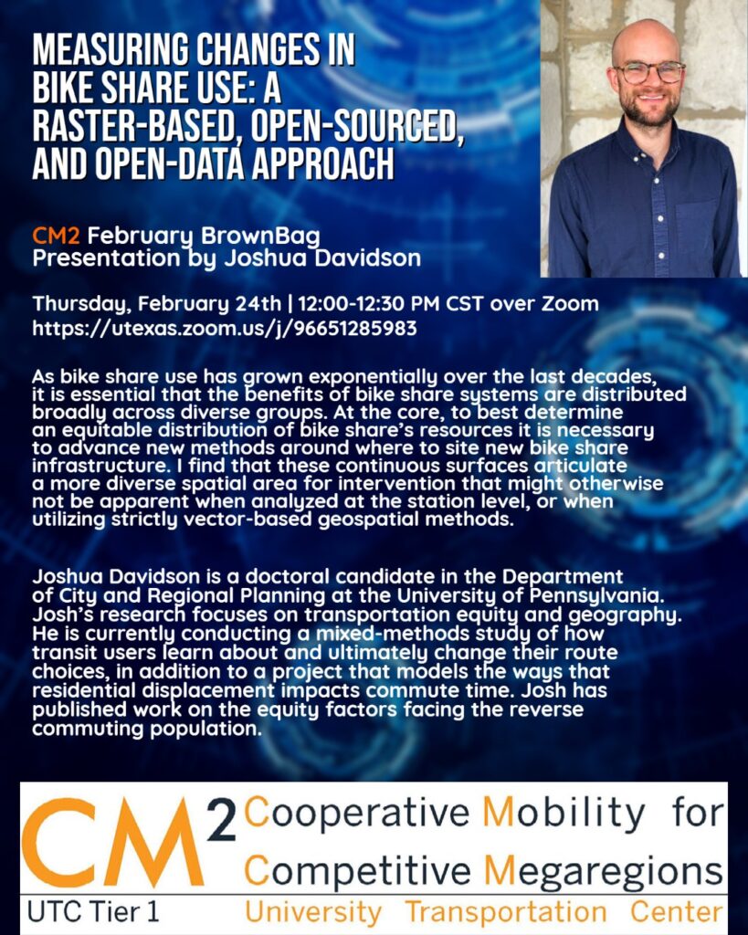 February 15, 2022, Filed Under: Announcements, EventsFebruary Brown Bag Presentation Set for the 24th Please join CM2 for an informative presentation from Ph.D. candidate Joshua Davidson (University of Pennsylvania) regarding measuring the change in bike share use. As cities large and small strive to increase transit options, bike share programs remain a popular topic. What does a data-based analysis show about these bike-share programs? Join us on February 24 at 12pm CT over Zoom to find out! CM2 February Brown Bag: Thursday, February 24, 2022 | 12pm CT