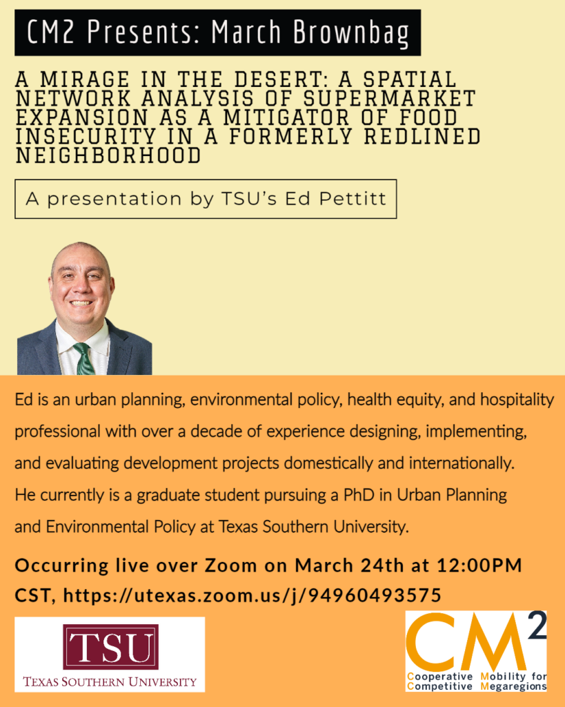 March 10, 2022, Filed Under: Announcements, EventsCM2 March 2022 Brown Bag Announcement: March 24th, 12:00PM CST What: CM2 March 2022 Brownbag Event When: Thursday, March 24, 2022, @12:00pm CST Zoom Meeting Link: https://utexas.zoom.us/j/94960493575 Please join CM2 on Zoom for our March spring Brownbag presentation occurring on March 24th from TSU’s Ed Pettitt.
