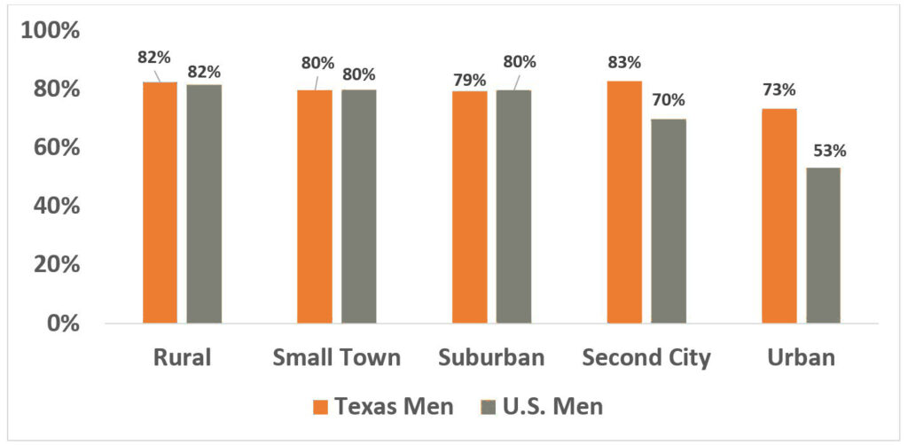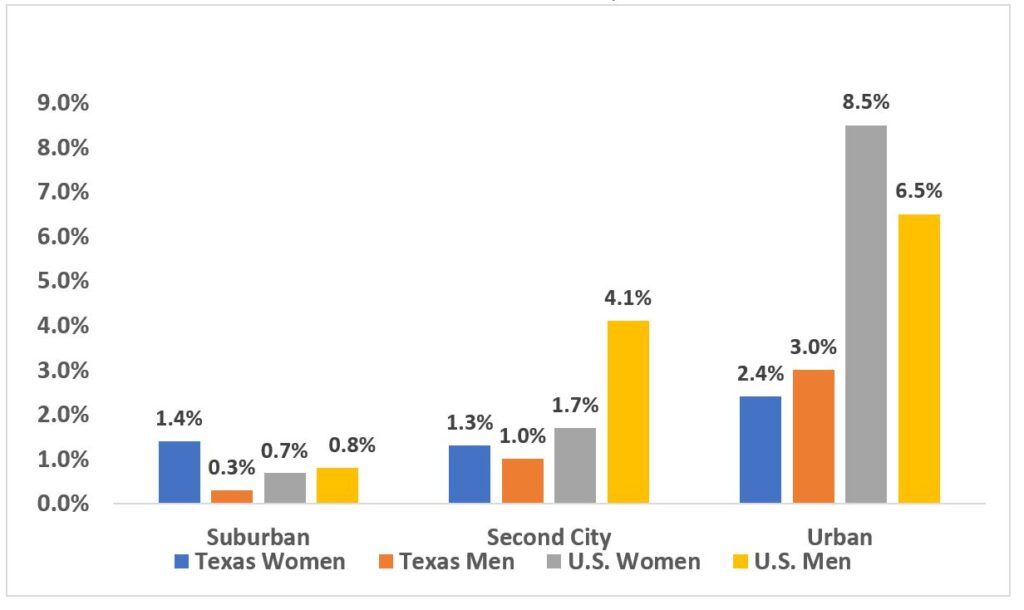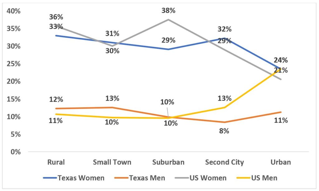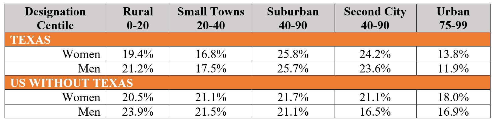 Do Texas Seniors Just Love Their Cars? The Relationship Between Population Density and Private Vehicle Use INTRODUCTION Texans 65 and older make the overwhelming share of their daily trips in a private vehicle, most often as the driver, and more so than comparable seniors in the rest of the country. Senior Texans, conversely, walk and use public transit far less than comparable U.S. seniors. Are these differences cultural or are they explained by where Texans 65 and older live and the nature of their neighborhoods? Texas seniors, as a group, largely live outside of dense city cores in low density suburban and rural neighborhoods. These kinds of neighborhoods are often associated with a greater reliance on a private vehicle. Conversely higher density and mixed use neighborhoods are generally associated with greater use of alternatives to the car, because the combination of density and multiple destinations makes walking, cycling, and public transit more feasible, while simultaneously making driving less attractive due to increased congestion and higher parking costs. Does the low density and residential nature of their neighborhoods explain why Texas seniors drive more than their peers? Or do Texans simply enjoy the freedom and convenience of driving themselves, enough to accept increasing traffic congestion, longer commutes, the costs of owning and maintaining multiple household vehicles, and substantial parking fees? We used unpublished data from the 2017 National Household Travel Survey (NHTS) to examine these questions. We found that Texans 65+, men and women, were simply not as responsive to the density of their neighborhoods as were comparable seniors nationally. The percent of the trips Texas seniors take driving a private vehicle* declined very little with increasing residential density. particularly for men; the impact was really only noticeable at the very highest density. Residential density, moreover, didn’t well explain differences between senior women and men anywhere, nor between senior women in Texas and comparable women in the rest of the nation. Rising residential density was better at explaining the use of public transit but only at the very highest density. Why didn’t we see a meaningful difference in driving as density increased among Texas seniors? And what does it mean? Our findings may be partially the result of the way the NHTS density data are categorized. But two other possibilities also stand out: there may be important variations in land use patterns and transit options in neighborhoods of comparable density across the country, and, there may be real cultural differences in how Texas seniors, particularly men, view the importance of owning and driving a car. The bottom line is that there is some evidence that Texas seniors, particularly men, really do love driving their cars more than comparable seniors nationally. THE NHTS AND DENSITY MEASURES The 2017 NHTS gives us the opportunity to examine the travel patterns of senior drivers in Texas and across the nation, questioning the relationship of residential density to mode choice. It contains the latest detailed data available on the travel patterns of US residents. The NHTS asked a large national sample of Americans about their travel patterns—where, when, and how they made trips; it also included a special “add-on” for the entire state of Texas. The NHTS characterized the nature of the neighborhood in which the respondents lived in a number of ways, including population density; to do so the survey used a proprietary classification approach—the Claritas system. Claritas characterizes every census block in the nation as falling into one of 99 centiles. The lowest centile, 0, is composed mostly of the Census blocks with the lowest population density in the U.S. The highest centile, 99, is composed mostly of Census blocks with the highest density in the country.* The centiles are thus relative and not absolute; think the Mojave Desert on one extreme and Manhattan (NY) on the other. The Claritas system then categorizes these centiles into five categories, ranging from the lowest to the highest density cluster of Census blocks. The system also differentiates two categories of centiles of the same density by characterizing those that are part of what it labels suburban and second city neighborhoods: Rural = 0 – 20th centile Small Town = 20 – 40th centile Suburban = 40 – 90th centile Second City = 40 – 90th centile Urban = 75 – 99th centile Table I compares the distribution of the population of Texas seniors to the national distribution of seniors across these categories (without Texas included). A smaller share of Texas seniors lives at the lowest—rural and small towns—densities. Slightly more than a third of Texas women and men over 65 live in rural areas and small towns compared to over 40% of comparable seniors in the rest of the nation. A smaller share of Texas seniors also lives in the highest density, urban, areas. Texas seniors are more likely to live in suburban areas and second cities, as Claritas characterizes them than their national counterparts; roughly 50% of Texas seniors live in these residential areas compared to only 40% of seniors nationally. Table I Senior (65+) Population Distribution by Neighborhood Density by Sex, 2017 POPULATION DENSITY AND SENIOR TRAVEL BEHAVIOR Figure I a and I b allow us to see the outlines of the relationship between population density and senior travel choices nationally and in Texas—and to observe some important differences by sex. These figures make clear that the decision to drive by Texas men 65+ is far less responsive to higher density than are the comparable decisions of their U.S. counterparts. It is equally clear that senior women are fairly unresponsive to increased density except at the highest level. Figure I a compares the percent of all trips taken by men 65 and above driving a personal vehicle (a car, light truck, SUV, etc) in Te