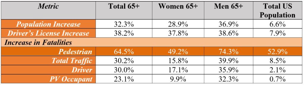 Texas Senior Pedestrians More at Risk Every Year Introduction Seniors in Texas and around the US walk for many of their trips; it’s their third most common travel mode, after driving or riding in a car. Seniors walk, moreover, for a greater percentage of their trips as they age. But walking is becoming more dangerous every year for all pedestrians. In 2018 pedestrian deaths accounted for more than 19% of all U.S. traffic fatalities—although car trips far outnumbered walking trips. National Highway Traffic Safety Administration data show that U.S. pedestrian fatalities are soaring, particularly for seniors. Total pedestrian death rates grew substantially faster than the growth of the population from 2009 to 2018; in that period the entire population of the US increased a little under 7% but the pedestrian death rate went up an astonishing 53%. The growth in pedestrian deaths among seniors, however, dwarfs the rates for the rest of the population; the number of men over 65+, for example, who died in a pedestrian crash went up 73% in that ten year period. Senior death rates in other types of traffic crashes have also gone up, unfortunately, but not in the dramatic way seen in pedestrian statistics. Pedestrian death rates among seniors went up roughly twice as fast as the increase in the senior population from 2009 to 2018. Texas is one of the most dangerous states for pedestrians; the state accounted for over 11% of all pedestrian deaths in the entire country in 2106 but only 8.2% of the country’s population. In fact, Texas, along with Arizona, California, Florida, and Georgia accounted for roughly half of all pedestrian deaths in the US but only one-third of the US population. The five major cities in the Texas Triangle megaregion have among the highest pedestrian fatality rates in all U.S. cities over one half million—in 2016 only three U.S. cities had a higher pedestrian fatality rate than Dallas, the city with the highest rate in the Texas Triangle. Below we expand on these figures. The data in this brief should serve as an early warning to Texas policymakers, engineers, gerontologists, and planners: Texas does not provide a friendly environment for seniors who want to walk in their community. To encourage seniors to reduce their growing dependence on the private car and to facilitate their walking safely and securely for exercise, social interaction, personal business, and to access public transit we have to make major policy changes now. We need substantial changes in our approach to providing and paying for pedestrian infrastructure, public safety, the placement and timing of traffic control devices particularly near areas where seniors live or want to travel, greater education for drivers, cyclists, and pedestrians themselves, and perhaps changes in vehicle design to make more pedestrian crashes survivable for vulnerable populations. We must start now or the state will be unable to meet the health and mobility needs of the growing number of Texans over 65, and increasingly over 85. Changing Pedestrian Death Rates Over Time: The U.S. In 2018 those 65 and above were 16% of the total population, but constituted over one in five pedestrian deaths in the United States. Table I makes clear how much faster the growth of the population and licensing was among US seniors by sex than in the total population between 2009 and 2018 (the latest US data). It also makes clear how much more likely seniors of both sexes were to be killed in pedestrian crashes over time than the general population. The column at the right of the table shows the change in the total population, in drivers licensing, and in four major types of traffic crashes (there are others) in the ten year period. The first three columns focus on these same statistics but only for people 65 and over, by gender. The senior population of the United States grew by a third from 2009 – 2018—roughly five times faster than the population as a whole (6.6%). Licensing rates for seniors grew even faster, 38% overall, compared to roughly 8% in the total U.S. population. These licensing figures don’t include many people who first obtained a driving license as they hit retirement; rather it represents the fact that the oldest seniors, and specifically women, may never have driven a car. Today, however, almost all men and over 90% of women reach their 65th birthday having driven for decades—so almost universal licensing among younger cohorts of the elderly show as a substantial increase in licensing among seniors. Table I shows that pedestrian crash deaths went up substantially for both younger and older people between 2009 and 2018, an alarming trend. More alarming is the fact that the number of senior pedestrian deaths went up much more that it did for the total population; pedestrian death rates for all seniors increased almost 65% or almost exactly double the rate of their population growth in the nine year period. Those rates, as with most crashes and deaths, were not evenly divided between the sexes; the pedestrian death rate among senior women went up roughly 50% compared to over 74% among comparable men. The Table makes clear that other types of senior traffic deaths have also increased significantly, but far less than the growth in the population 65+, or the growth in senior driver licensing. We always hope that all traffic death rates would decline over time due to aggressive traffic safety programs, particularly targeted at problematic drivers. To the extent there is good news here, however, it is that these rates are less than the increase in the population of, or licensing rates among, seniors. These data, however, highlight the substantial increases in pedestrian deaths among both the total population and seniors. Table 1: Change in Total U.S. Population, Population 65+ ,Driver Licensing, and Traffic Fatalities by Seniors (65+) By Sex, 2009 to 2018 The reality is that cars are becoming safer to drive than in past and 