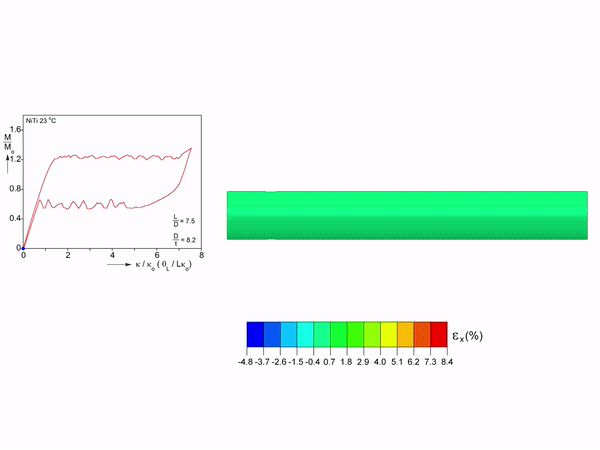 Tension induced phase transformation in pseudoelastic NiTi leads to inhomogeneous deformation with the austenitic and martensitic phases coexisting. Deformation of nearly 7% is recovered on unloading during which the deformation is again inhomogeneous. By contrast, under compression the transformation stress is significantly higher, the strain is lower and is essentially homogeneous. In pure bending experiments on pseudoelastic NiTi tubes, this asymmetry manifests as coexistence of two curvature regimes with diamond-shaped patterns of martensite developing on the tensioned side. The analysis reproduces the major features of the experimental results and provides insight into how the nonlinearities of the NiTi material interact with geometric nonlinearities.