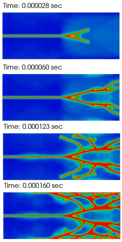 A two-dimensional example of the application of phase-field fracture modeling to dynamic, brittle fragmentation. The idealized model sample is a rectangular plate with an initial crack traversing through half of the centerline. Tensile tractions are applied on the top and bottom surfaces at time t = 0 and held fixed through the duration of the simulation. The contour plots show the phase-field variable with red indicating the location of the cracks and blue indicating intact material. At the level of applied traction shown the crack undergoes (a) branching, (b) secondary branching, (c) initiation of multiple secondary cracks, and (d) the interaction of cracks and the creation of fragments.