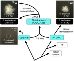 Cotton Cotton is the world’s most important renewable textile fiber and a significant oilseed crop [9]. Cotton fiber is widely used for apparel, home furnishings, and other diverse industrial products. World consumption of cotton fiber is ~115-million bales or ~27-million metric tons per year (National Cotton Council, http://www.cotton.org/, 2008). Improving cotton fiber yield and quality will provide a sustainable alternative to petroleum-based synthetic fibers. Efforts are also ongoing to modify cottonseed for food and feed [7, 10], which could enhance nutrition and livelihoods of millions of people in food-challenged economies. The current predominance of transgenic varieties that require less chemical application while increasing yield, together with research efforts to increase the abiotic and biotic stress resistance, predict that economically viable cotton crops can be grown in a sustainable manner in many warm global locations that also constitute major population centers in the developing world. Fully understanding the control of fiber development is a major goal to support future improvements in cotton fiber yield and quality as a cornerstone of this global vision. The genus Gossypium includes ~45 diploid (2n = 2x = 26) and five tetraploid (2n = 4x = 52) species. Diploid species fall into eight genomic groups (A-G & K). The African clade (A, B, E, and F genomes [8]) occurs naturally in Africa and Asia, while the D-genome clade is indigenous to the Americas. A third diploid clade (C, G, and K genomes) is found in Australia. Allotetraploids arose in the New World from interspecific hybridization between an A-genome-like African species and a D-genome-like American species, which occurred 1-2 million years ago (Mya) [11] (Figure 1). The closest relatives of the original tetraploid progenitors are the A-genome species Gossypium herbaceum L. (A1) andGossypium arboreum L. (A2) and the D-genome species Gossypium raimondii (D5) Ulbrich. Two of five allotetraploid species, Gossypium hirsutum L. and Gossypium barbadense L. are domesticated and cultivated. Interestingly, the A-genome species produce spinnable fiber and are cultivated on a limited scale, whereas the D-genome fiber is rudimentary and not useful [2]. The fiber in allotetraploids is much longer and stronger, suggesting activation or silencing of homoeologous fiber-related genes by genetic and epigenetic mechanisms [1, 3, 6, 11], leading to hybrid vigor [4]. Figure 1. Formation of allotetraploid cotton. Extant diploid progenitors diverge 7-8 millions years ago (Mya), and allotetraploidization occurred naturally 1-2 Mya between a fiber-producing AA-genome extant species and a fiber-poor DD-genome extant species, generating AADD allotetraploid species. Superior fiber yield and quality have been selected in allotetraploid cotton species, as well as the domesticated diploid G. arboreum. The genome sizes in parentheses are cited from [5]. Mbp: mega base pairs (106); Gbp: giga base pairs (109). Most production (>97%) in the U.S. is Upland cotton (G. hirsutum L., AD1), and the remainder is Pima cotton (G. barbadense L, AD2) with extra-long fiber that is sought after for high quality textiles. In 2009, over 12.5 million bales (1 bale = 170 kg) of fiber were produced in the US on over 30 thousand farms in 17 states covering >8 million acres, including Texas, California, Mississippi, and North Carolina. Texas alone accounts for 39% of the nation’s harvest in 2009. The total value of the annual US raw fiber crop is ~$6 billion, annual values of U.S. cotton sold overseas recently have averaged ~$3 billion (a trade surplus to the US), accounting for ~25% of the total world export market. Total business revenues from related US industries, such as gins, merchants, warehouses, oil and textile mills, account for more than $40 billion. In the US, nearly 450,000 jobs are directly linked to the cotton industry, and business revenue stimulated by the crop is estimated at $120 billion. The targeted introduction of fiber quality traits from G. barbadense into more adaptable and higher yielding G. hirsutum is a major goal for cotton improvement. The research proposed here will support this goal by identifying relevant controlling genes in two species. References Adams KL, Wendel JF: Polyploidy and genome evolution in plants. Curr Opin Plant Biol 8: 135-41 (2005). Applequist WL, Cronn R, Wendel JF: Comparative development of fiber in wild and cultivated cotton. Evol Dev 3: 3-17. (2001). Chen ZJ: Genetic and epigenetic mechanisms for gene expression and phenotypic variation in plant polyploids. Annu Rev Plant Biol 58: 377-406 (2007). Chen ZJ: Molecular mechanisms of polyploidy and hybrid vigor. Trends Plant Sci (10.1016/j.tplants.2009.12.003) (2010). Hendrix B, Stewart JM: Estimation of the nuclear DNA content of gossypium species. Ann Bot (Lond) 95: 789-97 (2005). Lee JJ, Woodward AW, Chen ZJ: Gene expression changes and early events in cotton fibre development. Ann Bot (Lond) 100: 1391-401 (2007). Mao YB, Cai WJ, Wang JW, Hong GJ, Tao XY, Wang LJ, Huang YP, Chen XY: Silencing a cotton bollworm P450 monooxygenase gene by plant-mediated RNAi impairs larval tolerance of gossypol. Nat Biotechnol 25: 1307-1313 (2007). Percival AE, Wendel JF, Stewart JM: Taxonomy and germplasm resources. In: Smith CW, Cothren JT (eds) Cotton: Origin, History, Technology, and Production, pp. 33-63. John Wiley & Sons, Inc., New York (1999). Smith CW, Cothren JT: Cotton: Origin, History, Technology, and Production. John Wiley & Sons, Inc., New York (1999). Sunilkumar G, Campbell LM, Puckhaber L, Stipanovic RD, Rathore KS: Engineering cottonseed for use in human nutrition by tissue-specific reduction of toxic gossypol. Proc Natl Acad Sci U S A 103: 18054-9 (2006). Wendel JF, Cronn RC: Polyploidy and the evolutionary history of cotton. Advances in Agronomy 78: 139-186 (2003).