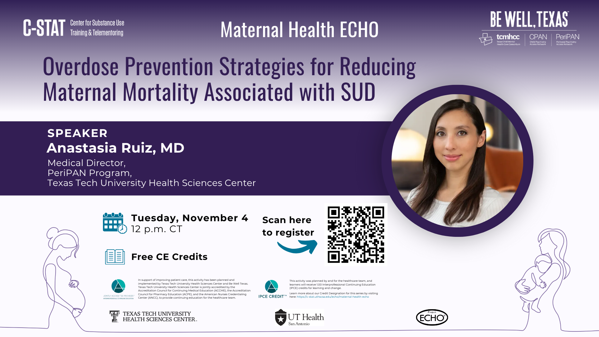 Nov. 4, 2025 – Overdose Prevention Strategies for Reducing Maternal Mortality Associated with SUD. Featured speaker: Anastasia Ruiz, M.D., PeriPAN Medical Director, Texas Tech University Health Sciences Center. View the flyer.