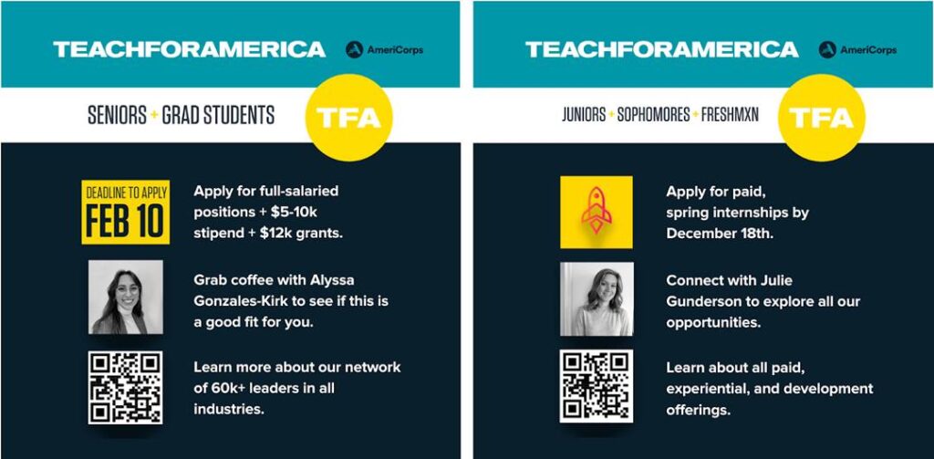 Seniors and Graduate Students: Are you interested in challenging yourself in an impact-driven career? By joining Teach For America, you will become part of a majority-BIPOC network of leaders shaping our country’s political, economic, and social future.