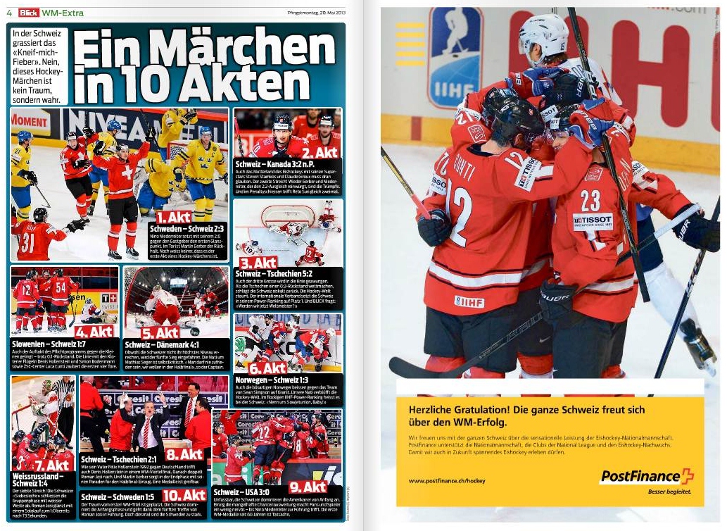 This is how the Blick special edition could frame the performance of the Swiss national team as “Ein Märchen in 10 Akten” (a fairy tale in 10 acts), again using the fairy tale metaphor while completely glossing over the fact that the tenth act did not have a happy ending. Likewise, the ad by PostFinance on the opposite page congratulates the team and states that “all of Switzerland is happy about the World Championship success.” Even for the postal bank, second place is as good as winning.