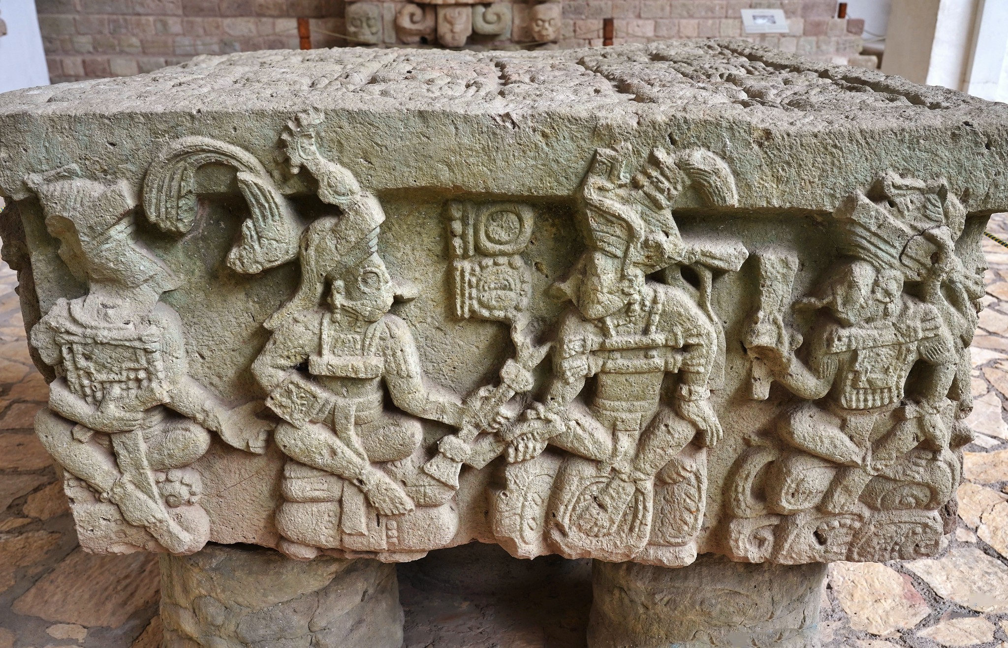 The rulers of Copán were conscious of their exceptional history, and they enshrined it in inscriptions and in an iconographic program on a number of altars and stelae. Altar Q, created in 763 CE and shown above, is one of the most outstanding monuments in the Mayan city of Copán. It represents the founder of the dynasty transferring the power to the 16th ruler of Copán by handing him the staff of office. The four sides of the altar show all 16 rulers, each passing on the insignia of power to his successor.