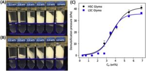 Figure 2. (a) Low- and (b) high-coverage (LSC and HSC) glymo-stabilized emulsions after centrifugation for 15 min at 5000 x g. (c) Calculated demulsification pressures for LSC (blue squares) and HSC (black circles) glymo-stabilized emulsions. Lines are to guide the eye. Figure from Griffith and Daigle (2020).
