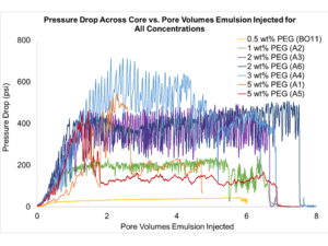 Figure 3. Pressure drop across a Boise Sandstone core versus pore volumes injected for flow of oil-in-water emulsions stabilized with PEG-coated silica nanoparticles at various concentrations. Figure from Hatchell et al. (2019).