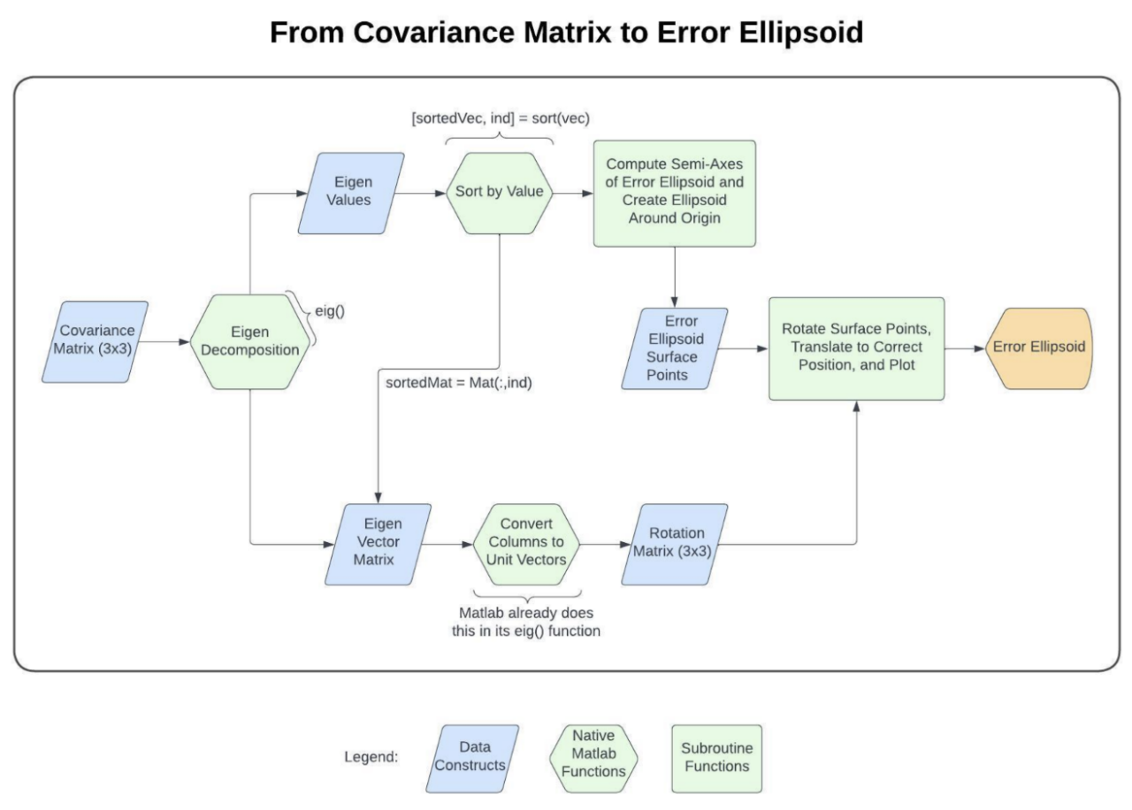The error ellipsoid is to be shown as the visualization of a 3D Gaussian model of a certain probability area. The diagram below depicts the current MATLAB workflow to plot the drone error ellipsoid using a given covariance matrix.