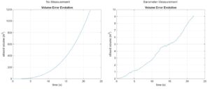 With the inclusion of even one additional sensor into the measurement model, the error ellipsoid volume is greatly reduced relative to the system with no new data. This is observed below in the error ellipsoid volume over time graphs below for the EKF without a measurement model and for the EKF including barometer measurement.