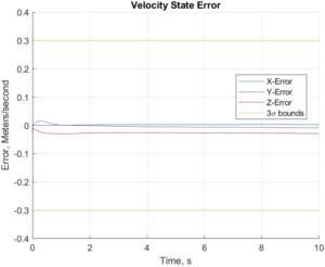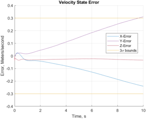 The changes we saw were in the above figures – the performance and confidence level of the z-position and z-velocity improved thanks to the barometer, and the confidence bounds of the yaw also get narrower with the updates of the magnetometer. It is of note that the z-velocity error does cross out of the confidence bounds near the end of the testing period, though.
